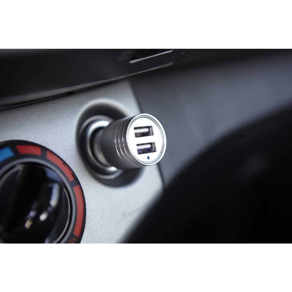 Autós adapter 2 USB kimenettel és vészhelyzeti ablalktörésre alkalmas véggel. Bemenet: DC 12-24V, kimenet: DC 5V/2.4A. Műanyag. Emblémázás: Gravírozás, Tamponnyomás