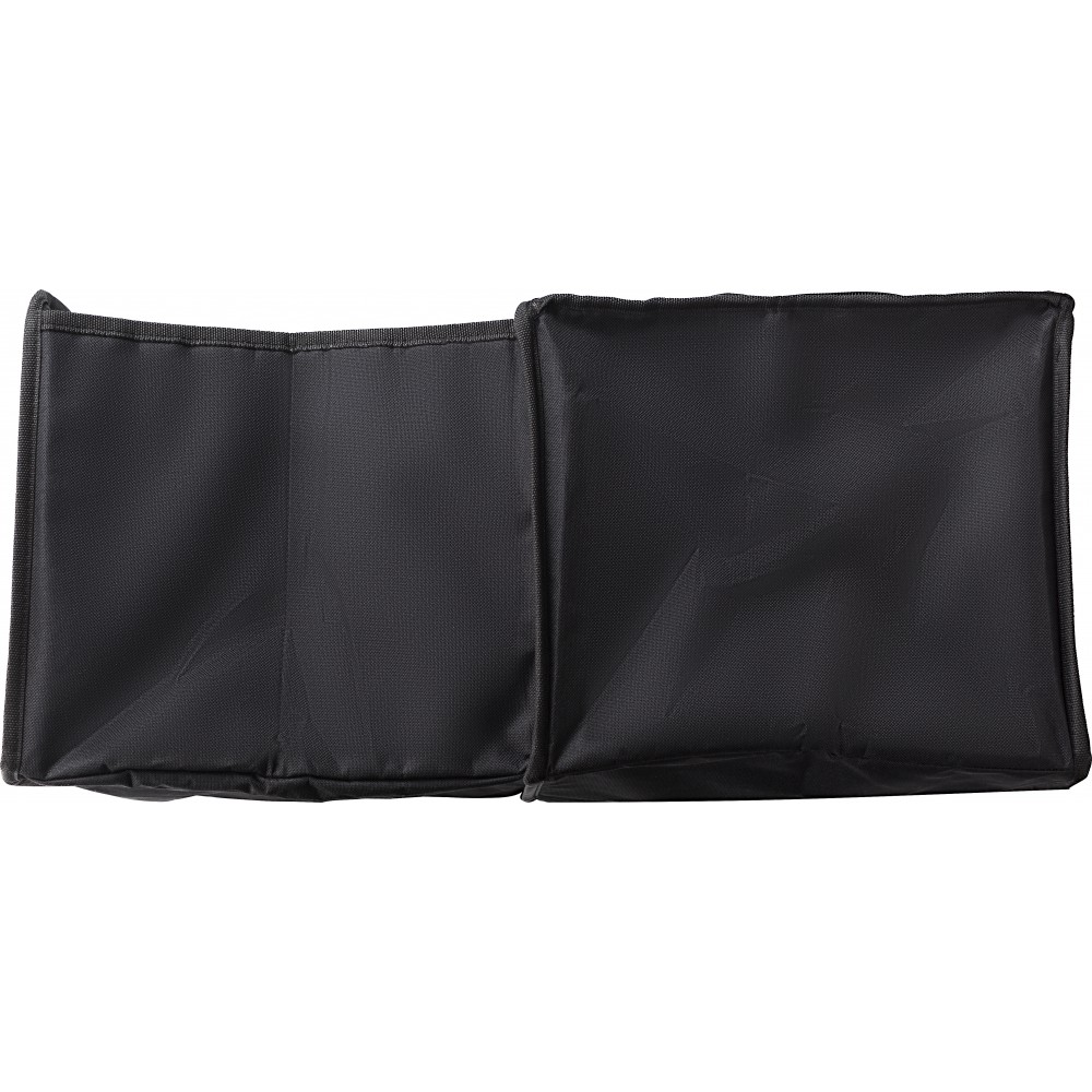 Autós rendező. Két rekesz, amelyből az egyik egy cipzárral zárható hűtőtáska alu szigeteléssel. Laposra hajtogatható. 600D poliészter. Emblémázás: Szitanyomás