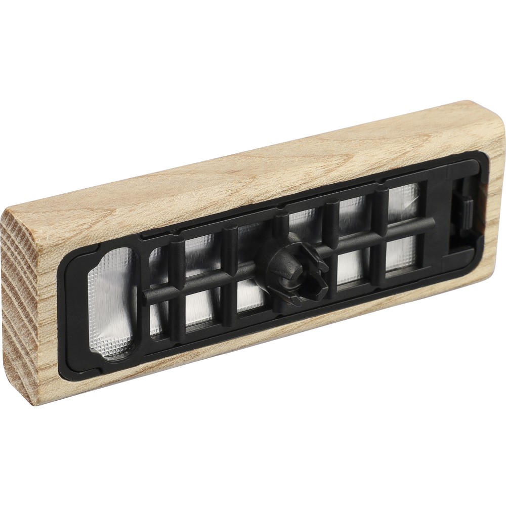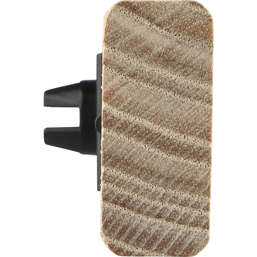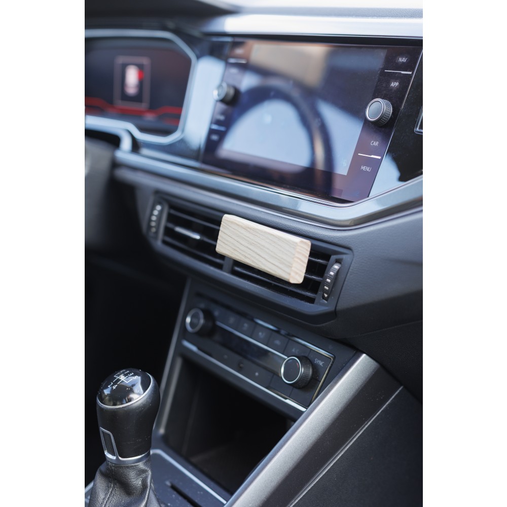 Natúr bükkfából készült autós légfrissítő, 2 × 3 g alkoholmentes szantálfa illattal (egy előre töltve, egy utántöltőként). ABS csipesszel ellátva a szellőzőrácsra történő rögzítéshez. Illusztrációval ellátott barna kartondobozba csomagolva.