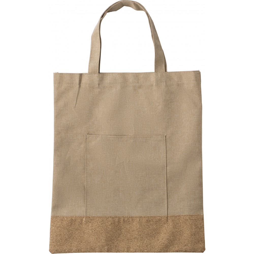 Bevásárlótáska parafa aljjal, rövid füllel. Elülső oldalán egy kis zseb található. 600D RPET poliészter. Emblémázás: Szitanyomás