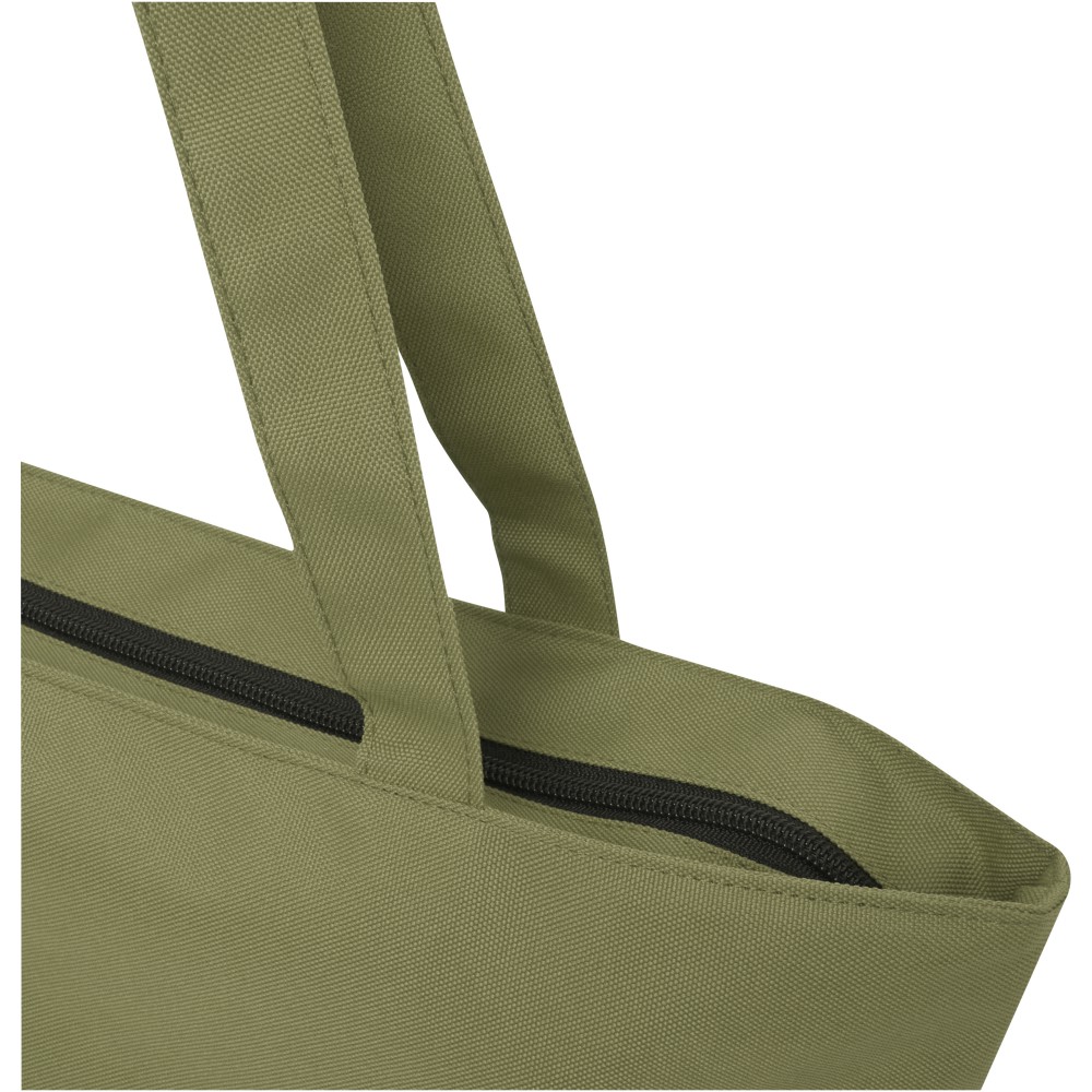 A vízlepergető 600D rPET anyagból készült Panama GRS újrahasznosított cipzáras táska tökéletes és fenntartható választás, ha rendezvényre, strandra vagy bevásárlásra készülsz. Egy cipzáras főrekesszel és egy cipzáras belső zsebbel rendelkezik, amely elég nagy a telefonod vagy más értékes holmi tárolására. Fülei 34 cm hosszúak, ezért a táska könnyen hordozható vállon. Teherbírás: 10 kg. PVC-mentes. Emblémázás: Szitanyomás