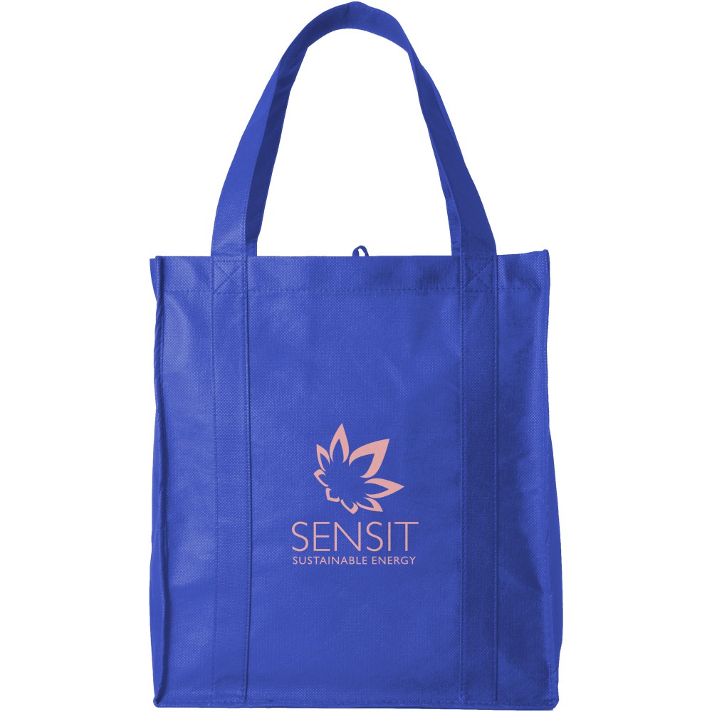 Liberty táska egy nyitott fő rekesszel, az alján merevítő betéttel. A fülek magassága 25,4 cm. Újrahasznosítható, nemszőtt anyag. Emblémázás: Szitanyomás