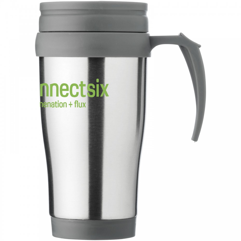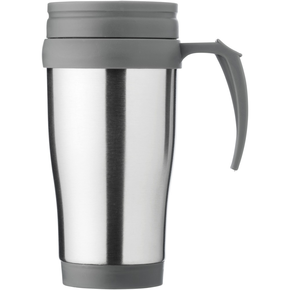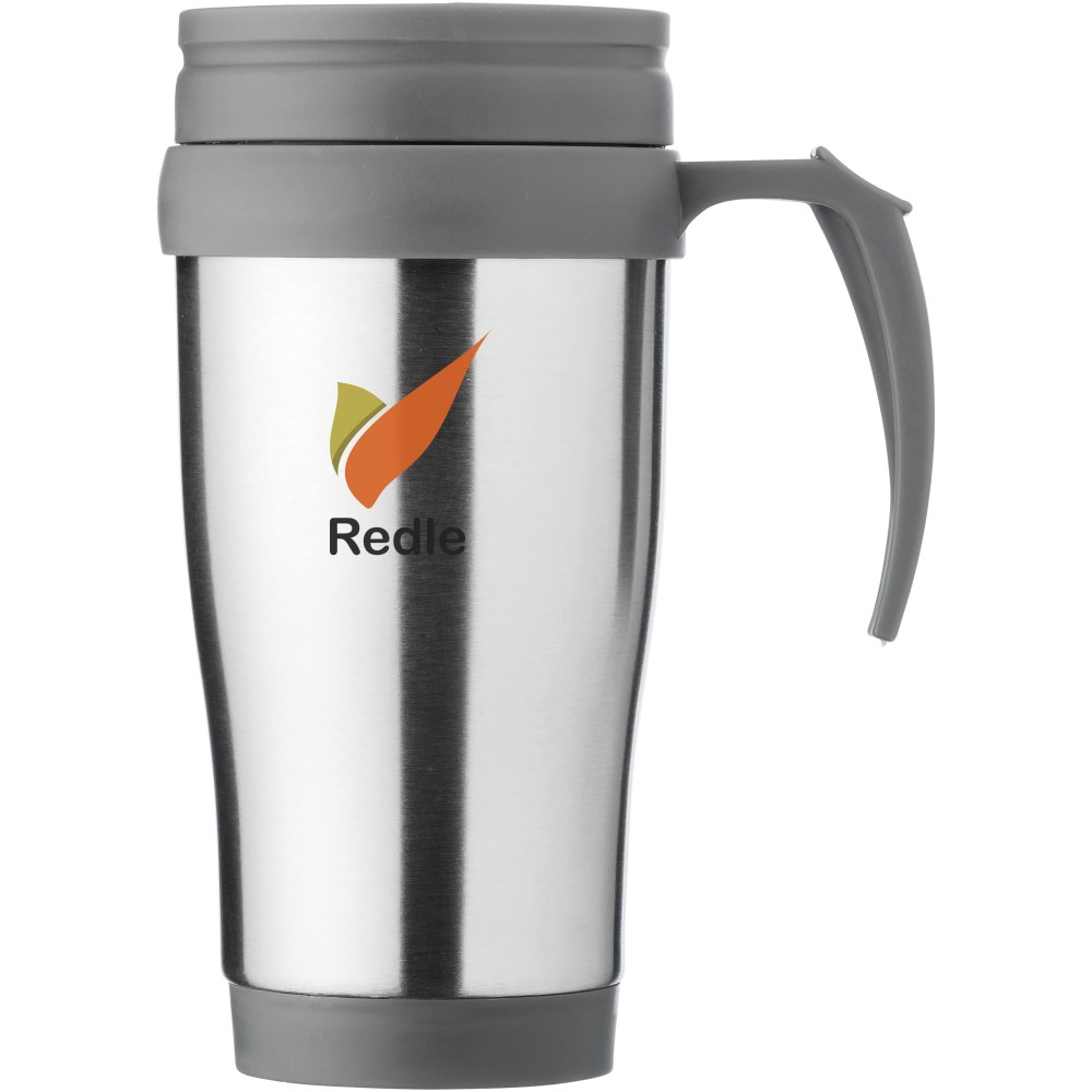 A Sanibel tökéletes bögre italok fogyasztásához útközben. A bögre dupla, szigetelt falú, így sokáig melegen tartja az italokat. A csavaros, elcsúsztatható fedél megkönnyíti az ital fogyasztását. Az ergonomikus hüvelykujjtámaszú fogantyú jó fogást biztosít. A Sanibel bögre rozsdamentes acélból és fekete műanyagból készült, így nagyon erős, korrózióálló és könnyen tisztítható. Nem szivárgásmentes. Szénsavas italokkal is használható. Mosogatógépben nem mosható és mikrohullámú sütőben történő melegítésre nem alkalmas. Űrtartalom: 400 ml. Emblémázás: Gravírozás, Körszita, Tamponnyomás