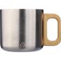 Duplafalú bögre fa fogantyúval. Mosogatógépben nem mosható. Gravírozott újrahasznosított rozsdamentes acél logóval. Egyenként barna kartondobozba csomagolva. Anyaga: újrahasznosított rozsdamentes acél. Űrtartalom: 400 ml. Emblémázás: Gravírozás