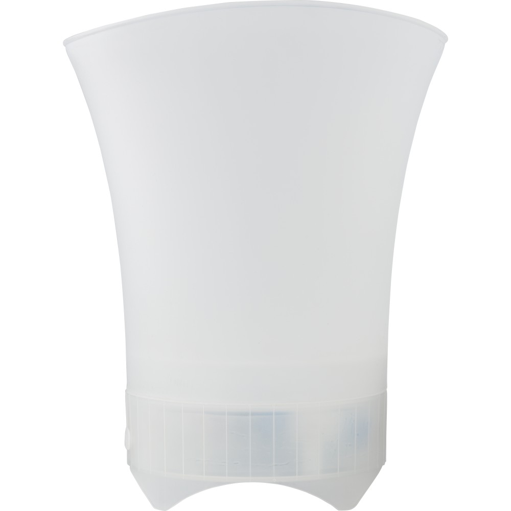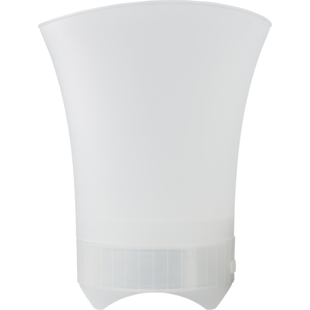 ABS jegesvödör hangszóróval. Színváltó fények az alján és vezeték nélküli technológia. 1200 mAh kapacitású akkumulátor. Darabonként színes díszdobozba csomagolva érkezik. Emblémázás: Tamponnyomás