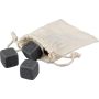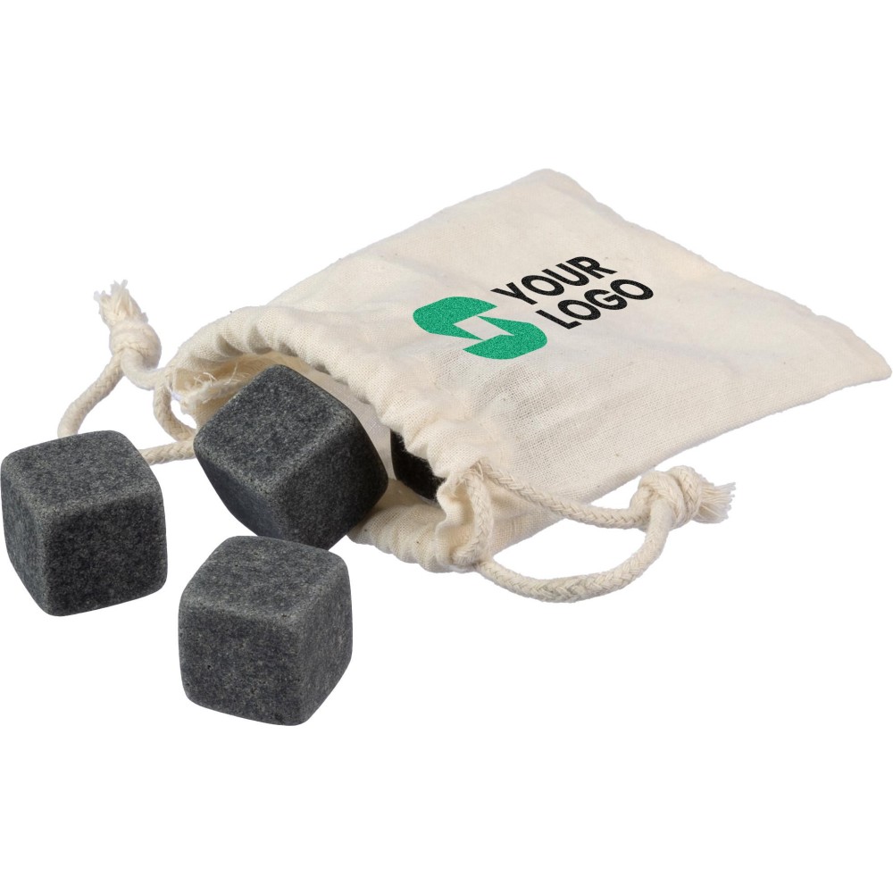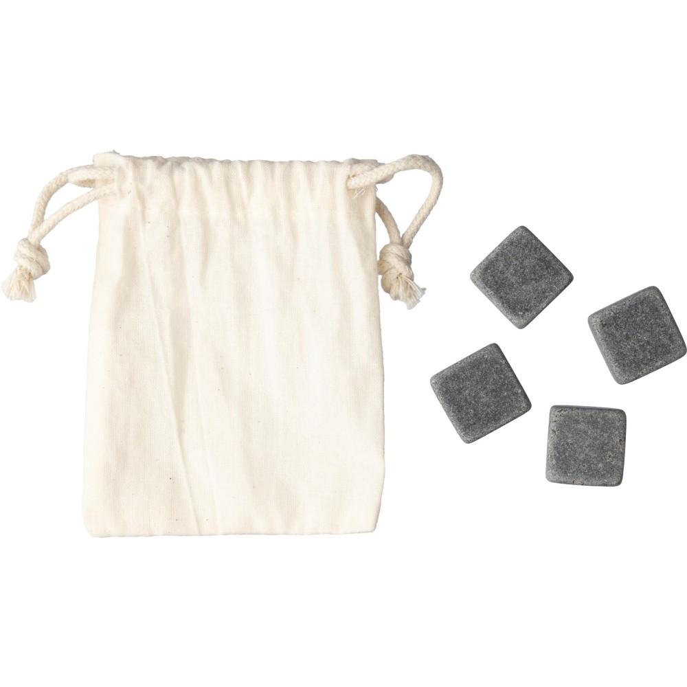 4 db újrafelhasználható természetes kőből álló kockakészlet. A köveket hűtőbe kell tenni, hogy lehűljenek. Pamut zsinóros tasakban csomagolva érkezik. Emblémázás: Szitanyomás