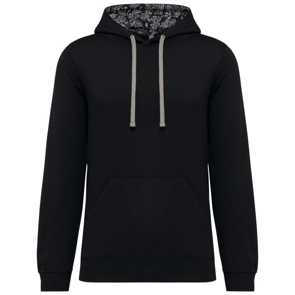 80% fésült pamut/20% poliészter. 3 fonalú pamut. Karcsú szabás. Egyenes ujjak. Kenguru zsebek. Félhold alakú betét a nyakkivágásnál, hogy megkönnyítse a díszítéshez való hozzáférést a nyakkivágás belsejében. 1x1 bordázott mandzsetta és szegély. Tematikusan nyomtatott pamut trikószövetből készült, kontrasztos húzózsinórral bélelt kapucni. Letéphető márkacímke. Emblémázás: Hímzés, Szitanyomás