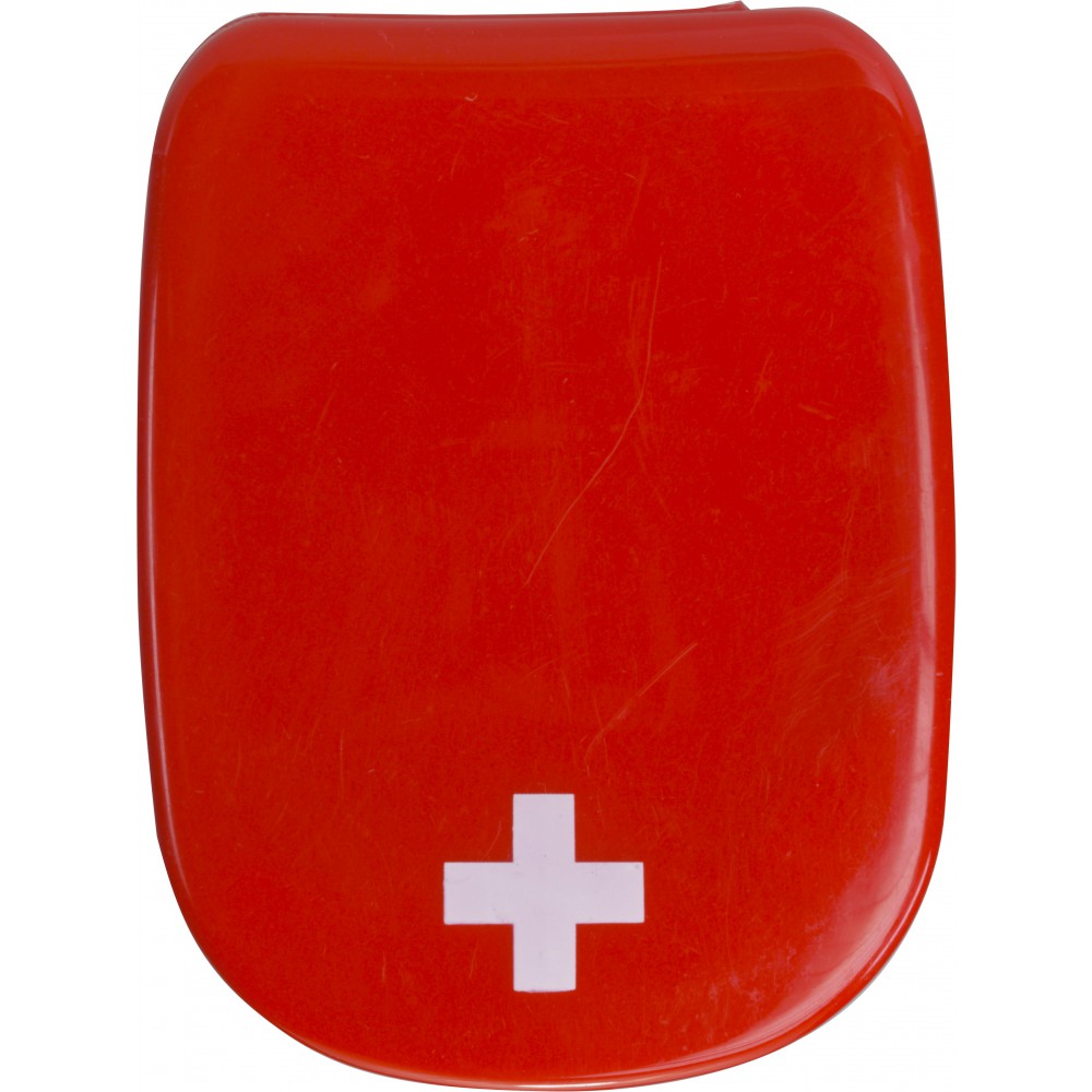 Elsősegélykészlet műanyag dobozban. Tartalma: 2 db alkoholos törlőke, 1 db fertőtlenítő törlő, 2 db ragtapasz. Emblémázás: Tamponnyomás, UV nyomtatás