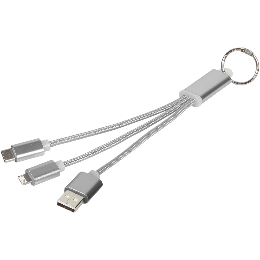 3in1 töltőkulcstartó C és A típusú USB kábellel, és 2in1 töltőcsatlakozóval iOS és Android készülékek számára. Alumínium. Emblémázás: Gravírozás, Tamponnyomás