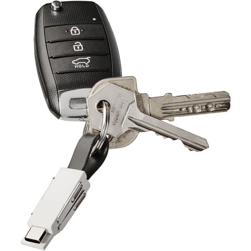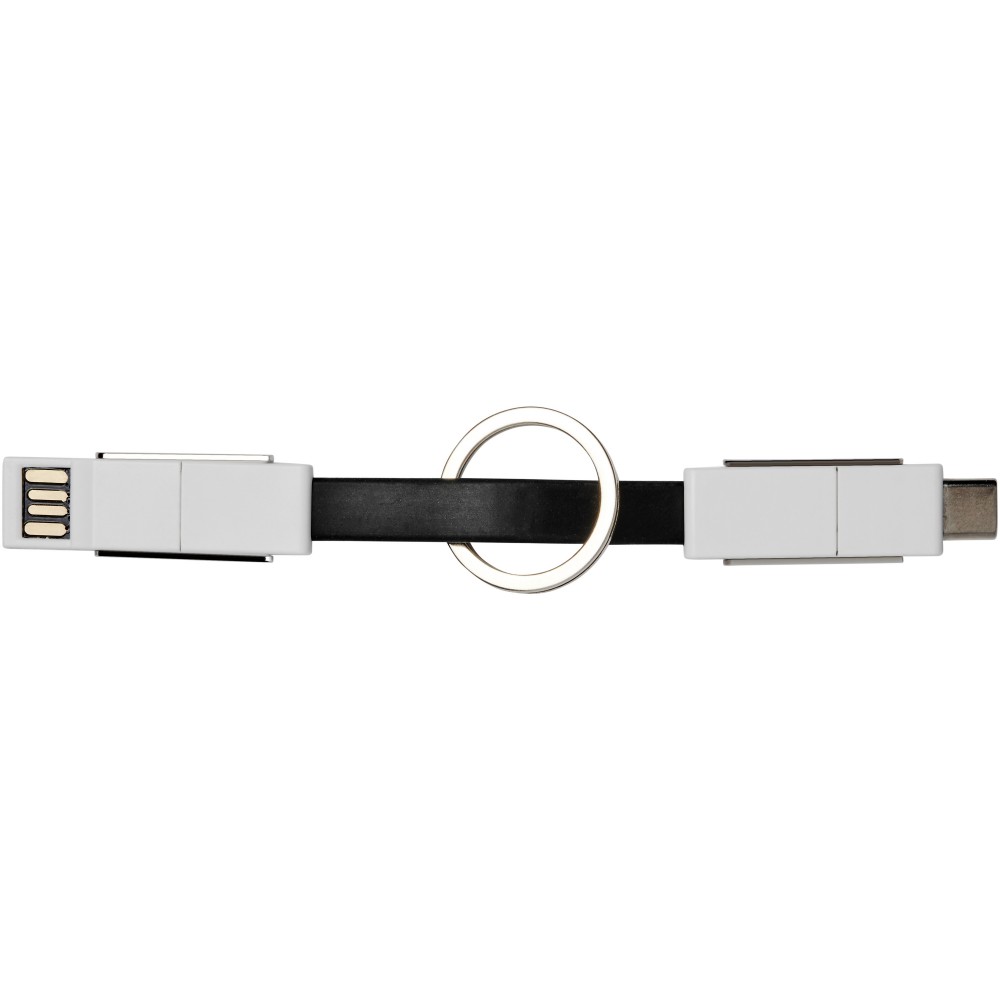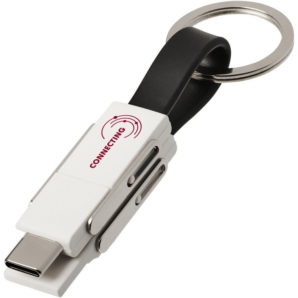 4in1 csatlakozók kulcstartóval, mágnessel. Lefed minden csatlakozási lehetőséget: USB type A, Type-C, 2-in-1 csatlakozó iOS és Android eszközökhöz. Töltésre és adatátvitelre is alkalmas. ABS műanyag. Emblémázás: Tamponnyomás