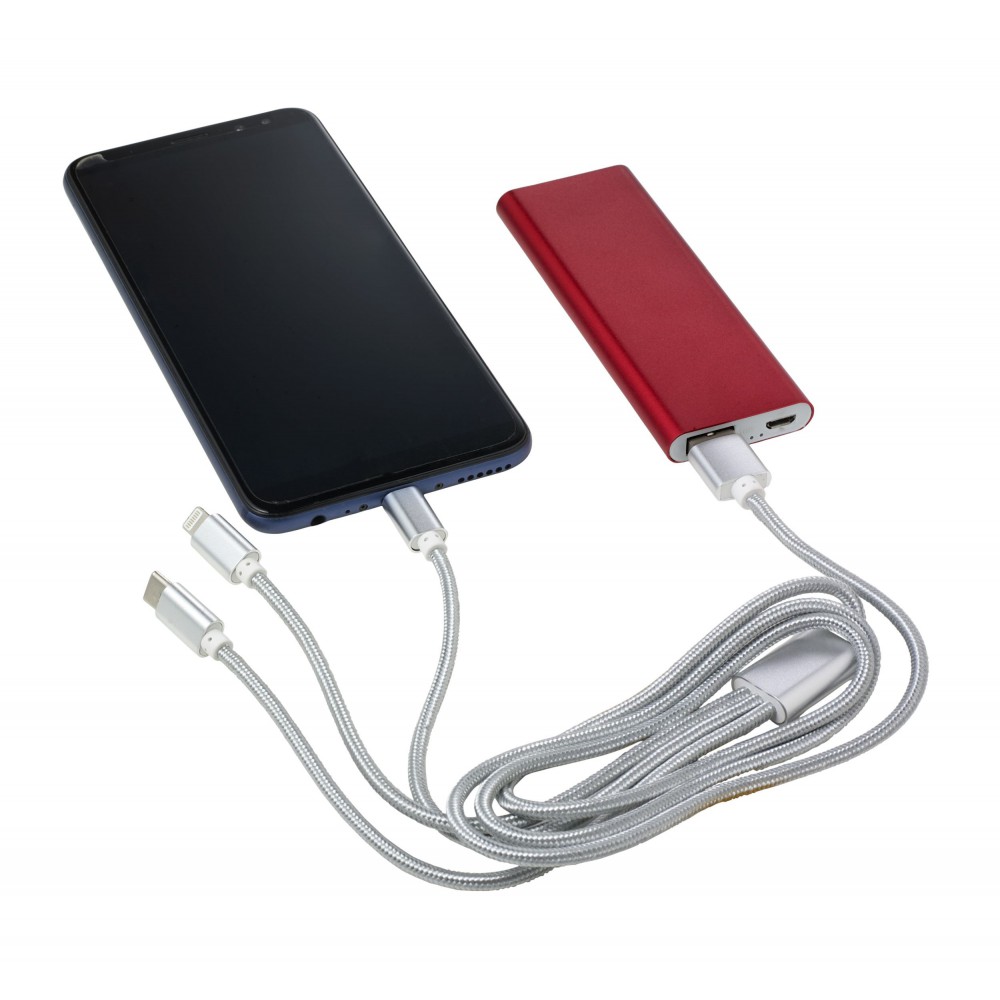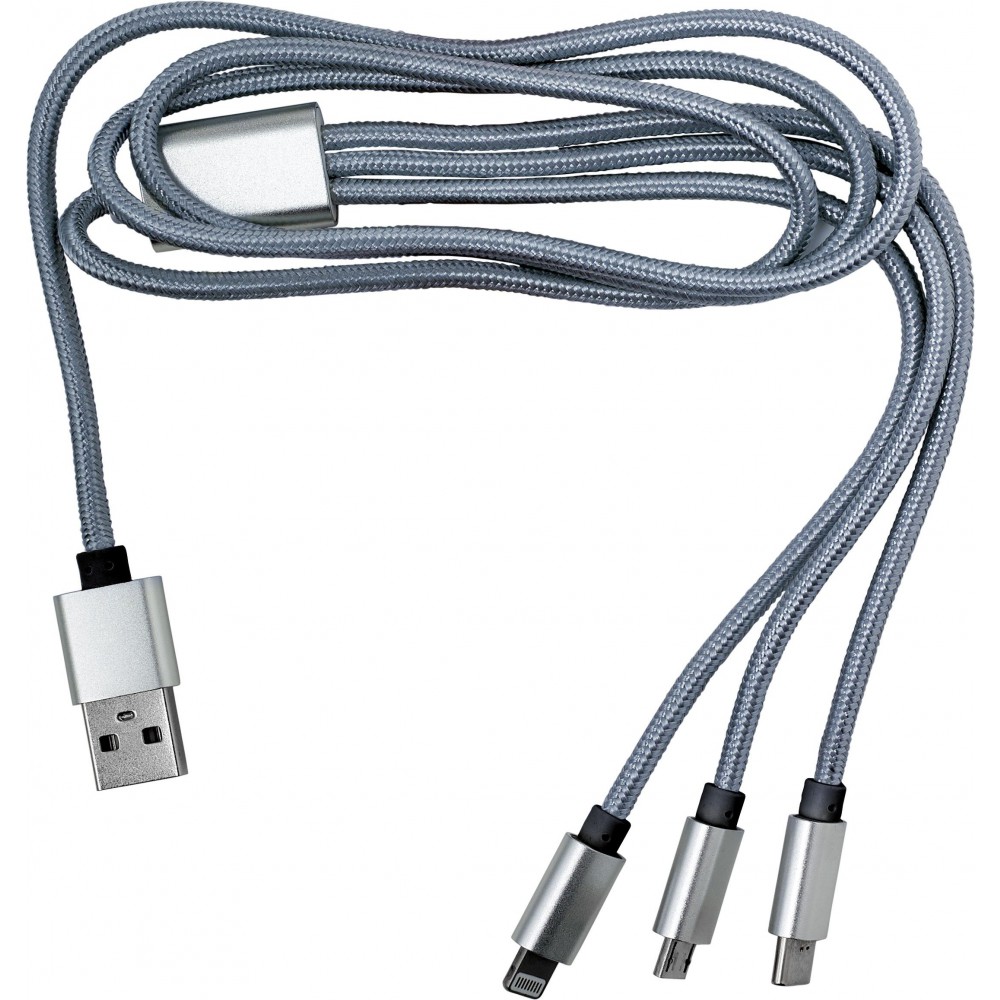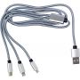 Töltőkábel az egyik végén USB csatlakozóval, a másik végén mikro USB, USB-C és Lightning csatlakozókkal. Nylon. Emblémázás: Gravírozás, Tamponnyomás