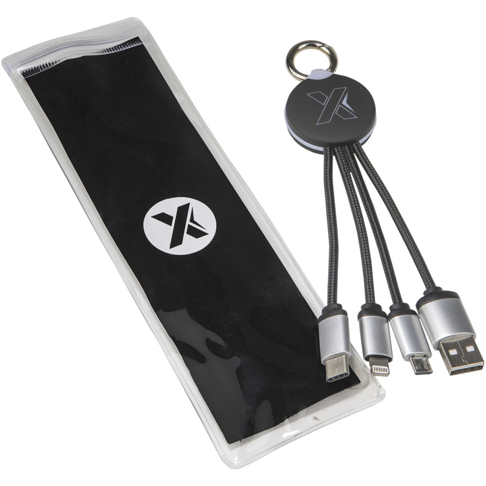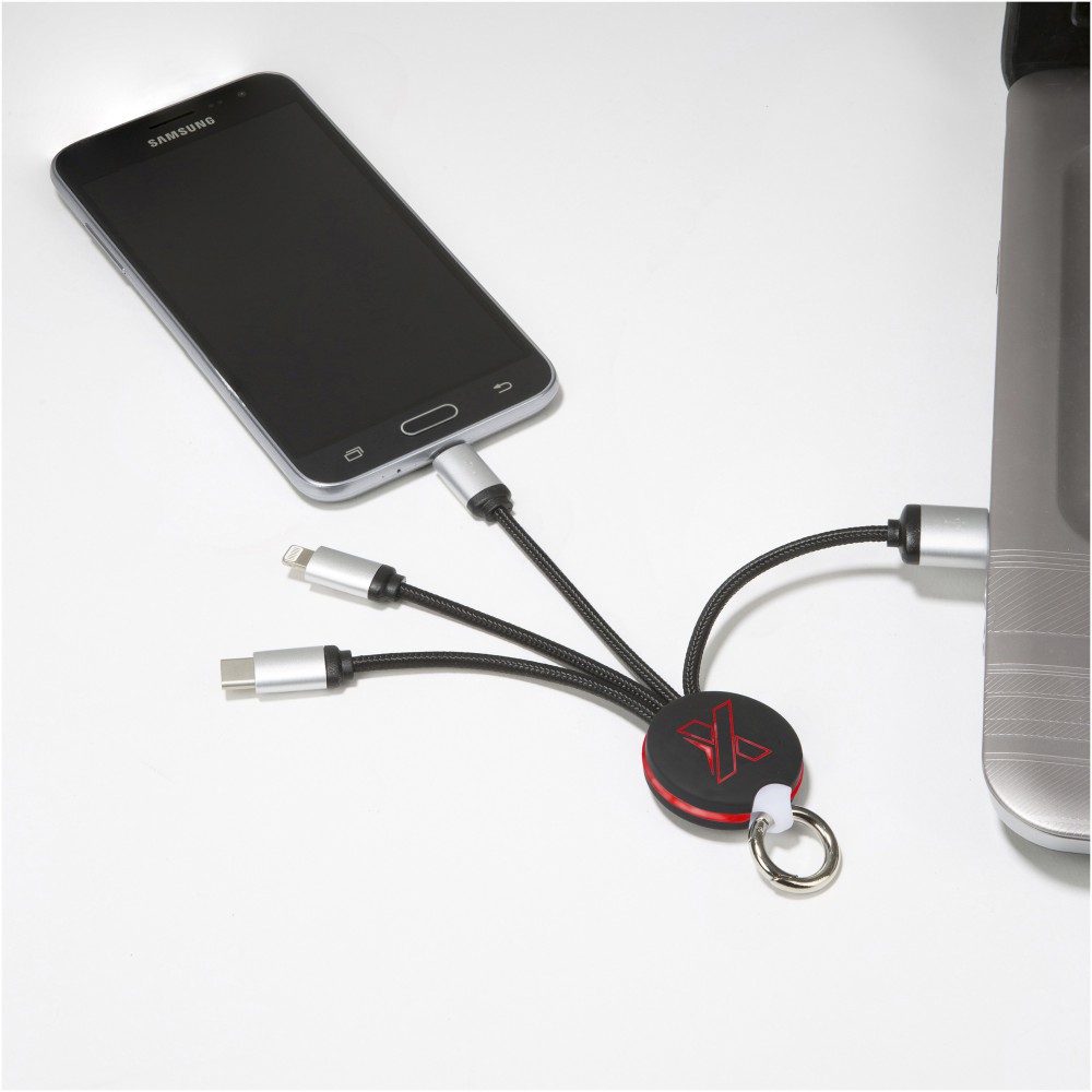 Világító logós töltőkábel gumi és fém bevonattal, három csatlakozóval (Type-C, Android, iPhone). Egyszerre akár három készülék is tölthető. Kábelek hossza (dugókkal együtt): 10 cm. Az újrahasznosított PET műanyag kábel és csomagolás újrahasznosított papírból és újrahasznosított műanyagból készül. Emblémázás: Gravírozás