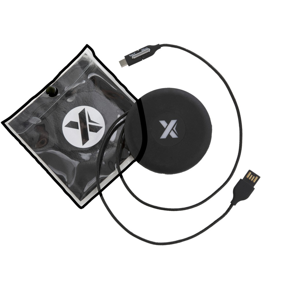 Világító logóval ellátott töltőkábel három csatlakozóval (C típusú, Android, iPhone). Szilikon tárolótasakja van, így tökéletes útközbeni kiegészítő. A csomagolás újrahasznosított papírból és újrahasznosított műanyagból készül. ABS műanyag, újrahasznosított PET műanyag. Emblémázás: Gravírozás