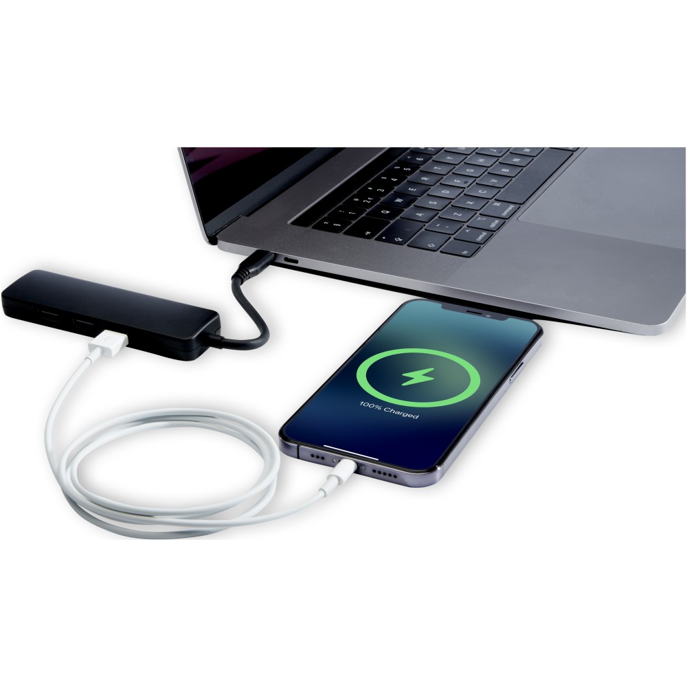 A Loop RCS újrahasznosított műanyag Type-C adapter a különböző portoknak köszönhetően minden kihívásra megoldást kínál. Csatlakoztass egeret és billentyűzetet a dupla USB 2.0 porthoz, másolj nagyméretű fájlokat nagy sebességgel az USB 3.0 vagy Type-C porton keresztül és/vagy csatlakoztasd laptopod külső monitorhoz/TV-hez/kivetítőhöz a beépített HDMI kimenet segítségével, amely akár 4K felbontást is támogat. Felhasználói kézikönyvvel, 100%-ban újrahasznosított dobozban szállítjuk. Emblémázás: Tamponnyomás