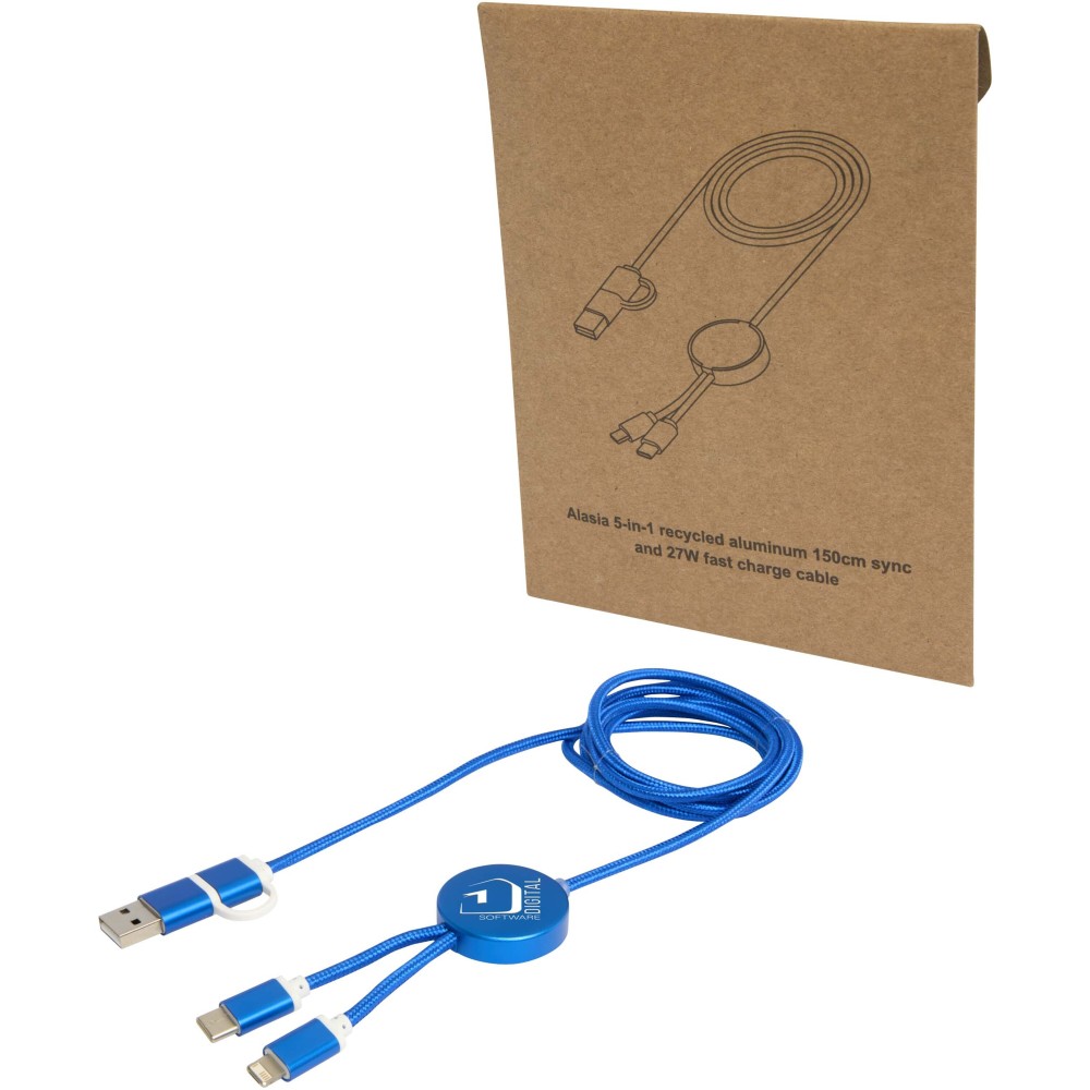 Az Alasia 5 az 1-ben adat- és 27W-os gyorstöltő kábel tartós és elegáns újrahasznosított alumíniumból és műanyagból készült. A kábel USB-A és Type-C bemeneti csatlakozókkal, valamint Type-C és Lightning/Micro USB kombinált kimeneti csatlakozóval rendelkezik. Az USB-A?USB-C kapcsolat maximális teljesítménye 27W, míg az összes többi kapcsolat maximális teljesítménye 15W. Kompatibilis a CarPlay és az Android Auto rendszerekkel. Akár otthon, az irodában vagy útközben használod, az Alasia kábel teljesítményt és stílust garantál. Kábel hossza: 150 cm. Emblémázás: Gravírozás, Tamponnyomás