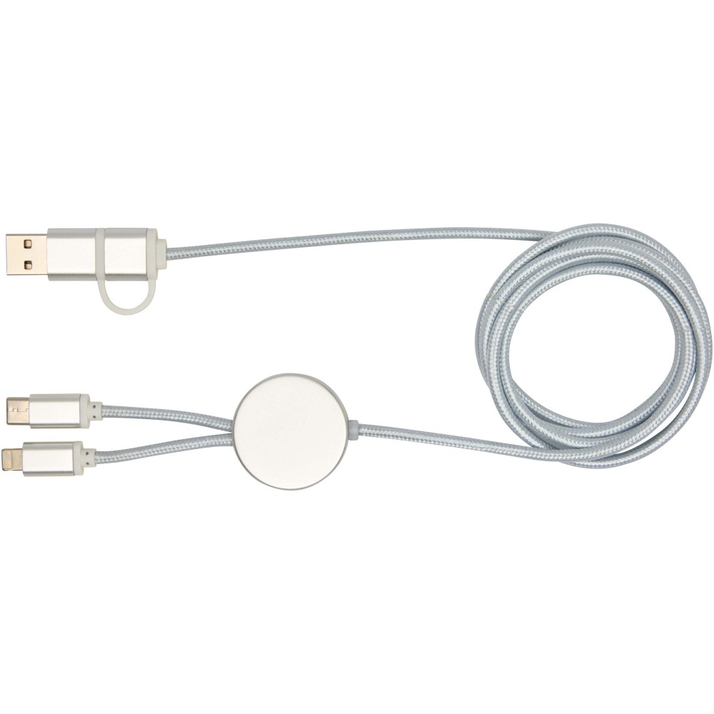 Az Alasia 5 az 1-ben adat- és 27W-os gyorstöltő kábel tartós és elegáns újrahasznosított alumíniumból és műanyagból készült. A kábel USB-A és Type-C bemeneti csatlakozókkal, valamint Type-C és Lightning/Micro USB kombinált kimeneti csatlakozóval rendelkezik. Az USB-A?USB-C kapcsolat maximális teljesítménye 27W, míg az összes többi kapcsolat maximális teljesítménye 15W. Kompatibilis a CarPlay és az Android Auto rendszerekkel. Akár otthon, az irodában vagy útközben használod, az Alasia kábel teljesítményt és stílust garantál. Kábel hossza: 150 cm. Emblémázás: Gravírozás, Tamponnyomás