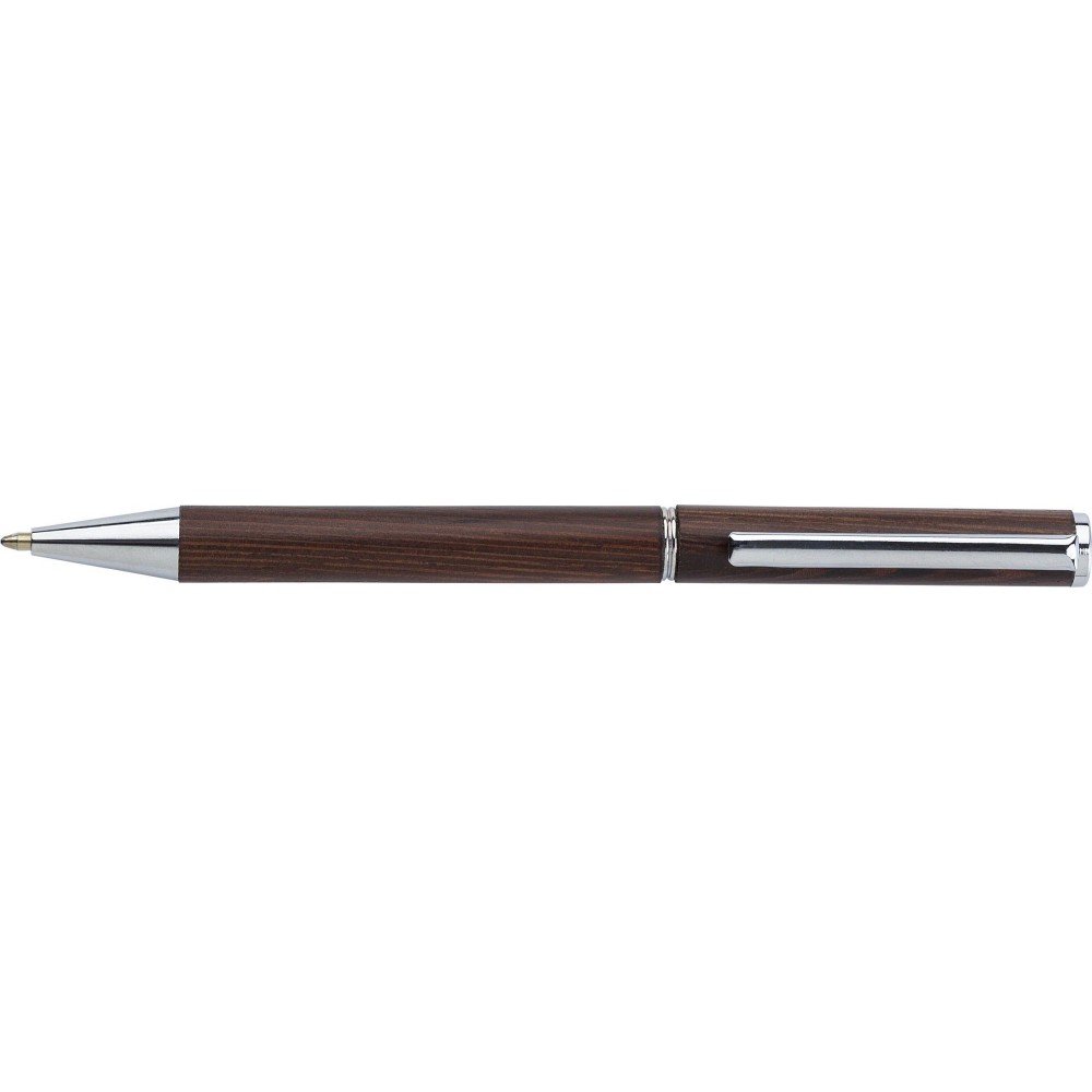 Feketefa golyóstoll csavaros mechanizmussal és fém klipsszel. Kék tollbetéttel. Emblémázás: Tamponnyomás