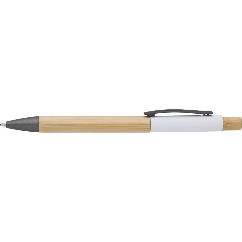 Bambusz golyóstoll alumínium kiegészítőkkel, kék tollbetéttel. Grafit színű hegy és klipsz, bambusz nyomógomb. Emblémázás: Gravírozás, Tamponnyomás
