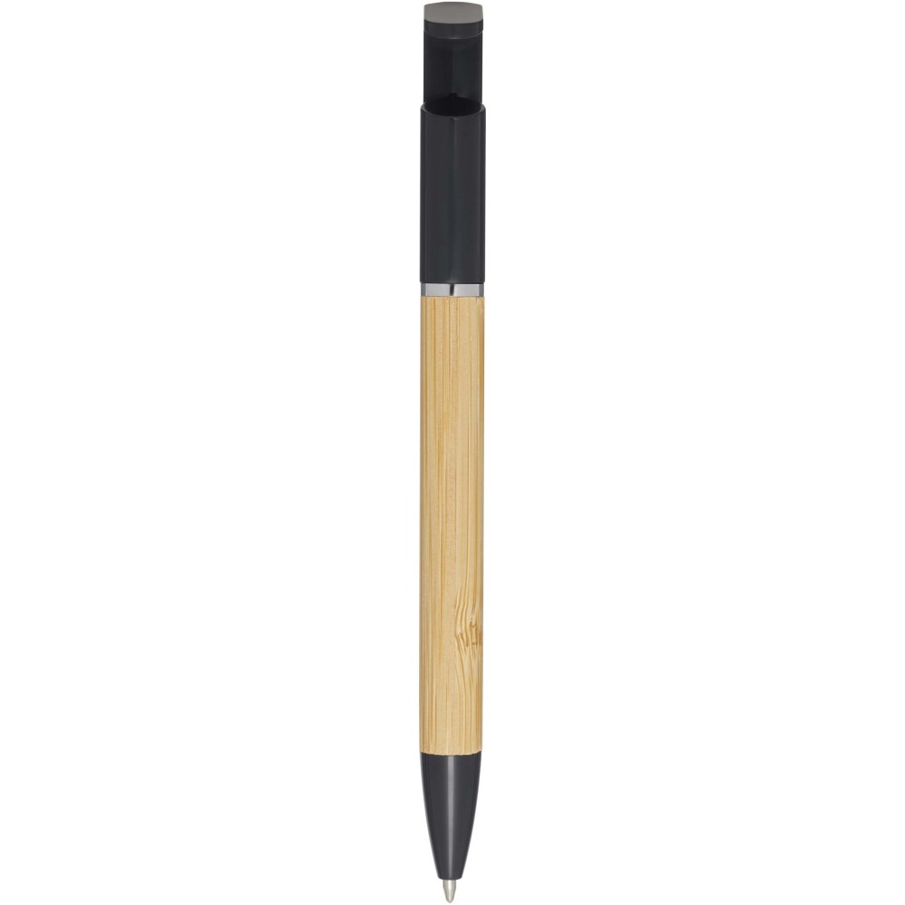 Bambusz golyóstoll, amely telefontartóként is funkcionál. A gomb és a középső gyűrű újrahasznosított műanyagból, a hegy rézből, a tollteste pedig felelősen beszerzett bambuszból készült. Fekete tollbetéttel. Írási hossz: 1000 méter. Tollhegy mérete: 1,0 mm. Emblémázás: Tamponnyomás, UV nyomtatás