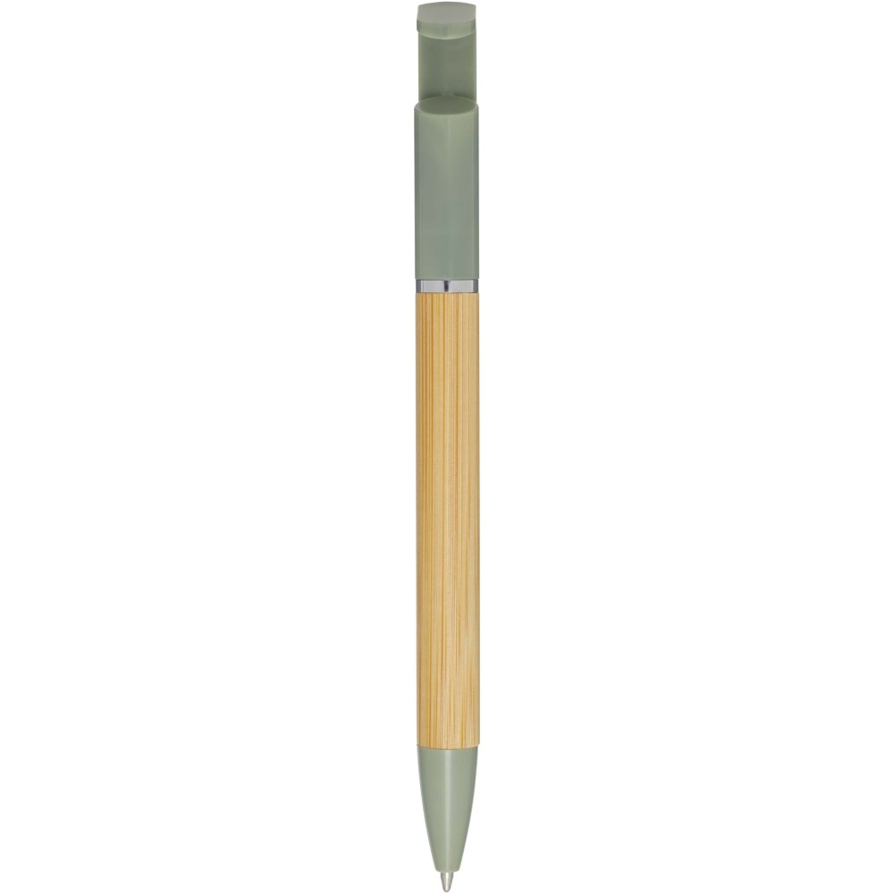 Bambusz golyóstoll, amely telefontartóként is funkcionál. A gomb és a középső gyűrű újrahasznosított műanyagból, a hegy rézből, a tollteste pedig felelősen beszerzett bambuszból készült. Kék tollbetéttel. Írási hossz: 1000 méter. Tollhegy mérete: 1,0 mm. Emblémázás: Tamponnyomás, UV nyomtatás