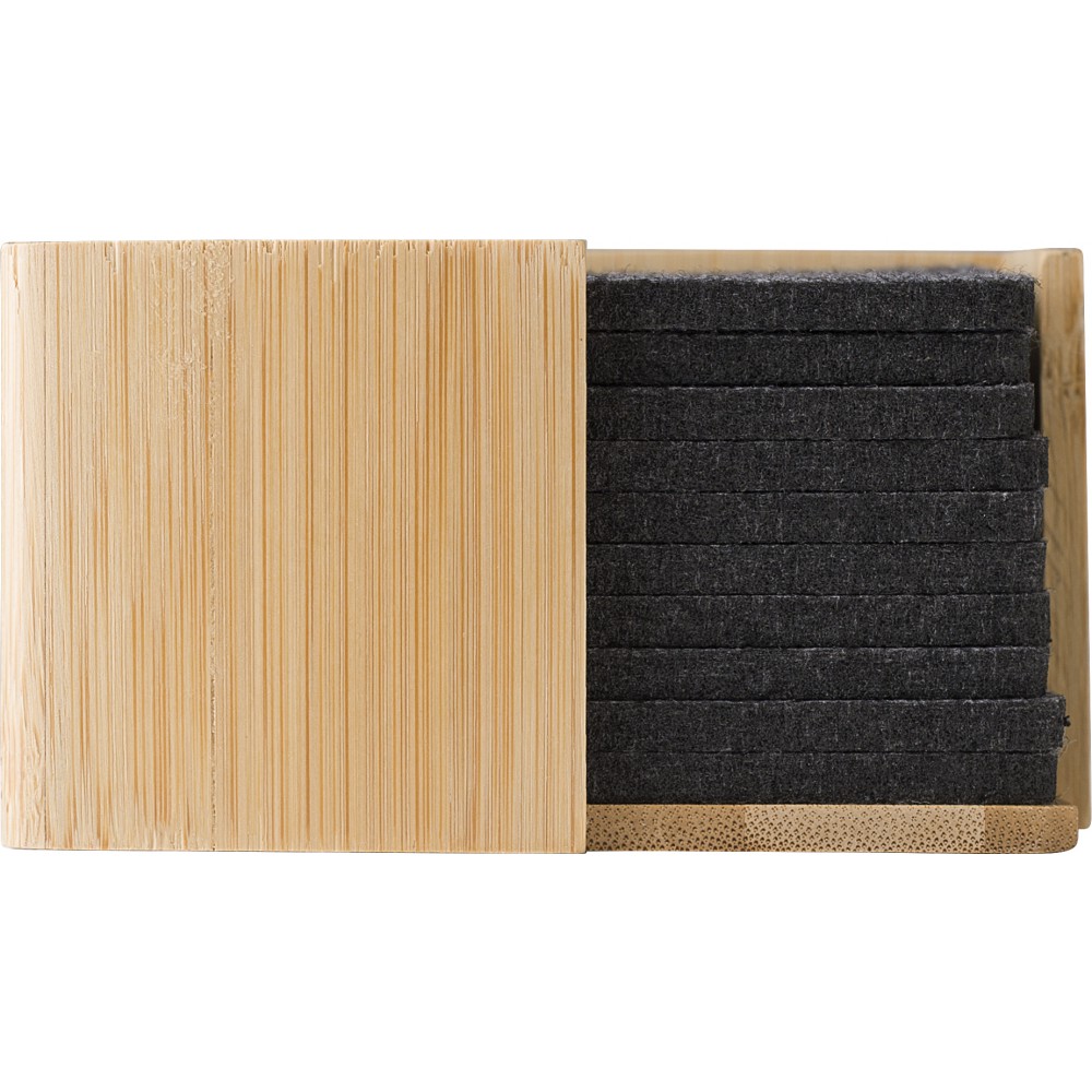 RPET filc poháralátét szett bambusz tokban. 10 darab alátétet tartalmaz. Barna kartondobozba csomagolva. Minden alátéten szerepel az újrahasznosított jel nyomata. Emblémázás: Gravírozás, Szitanyomás, Tamponnyomás