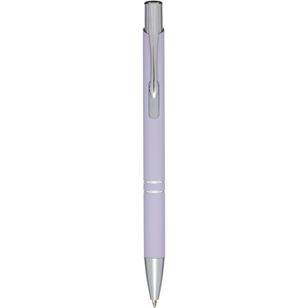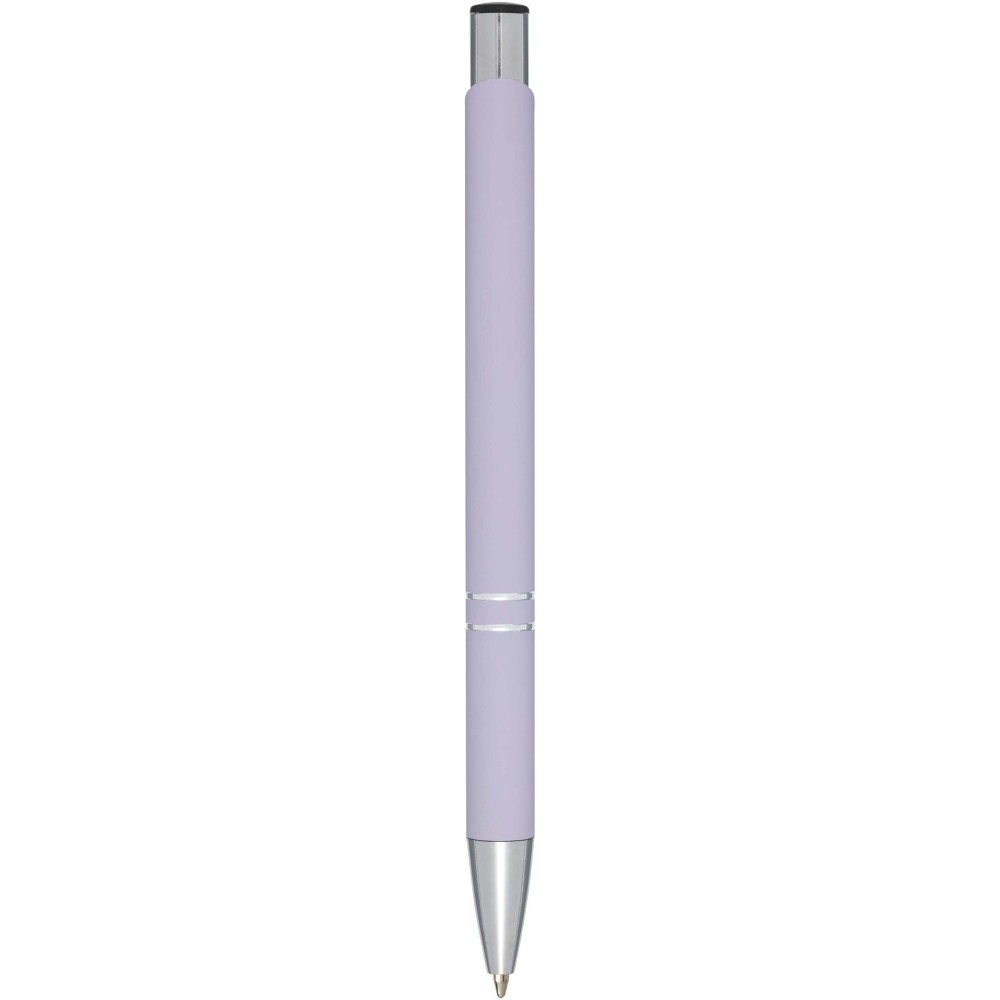 Nyomógombos golyóstoll puha tapintású bevonattal. Lézergravírozáskor megjelenik a toll fényes króm, felület alatti rétege. Fekete tollbetéttel. Emblémázás: Gravírozás