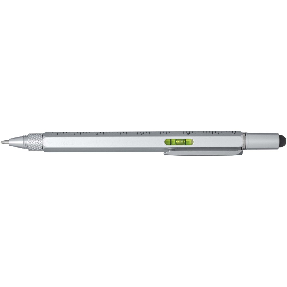 A Dora alumínium multifunkciós golyóstoll részben újrahasznosított anyagokból készült, és tartalmaz kétoldalas vonalzót, csavarhúzót, vízmértéket, valamint egy fekete gumiból készült érintőt. A tollteste újrahasznosított alumíniumból készült, ezüst spray bevonattal. A klipsz vasból, a csavarhúzó acélból, a felső rész és a hegy pedig újrahasznosított ABS anyagból készült. Fekete tollbetéttel. Írási hossz: 400 méter. Tollhegy mérete: 1,0 mm. Emblémázás: Gravírozás