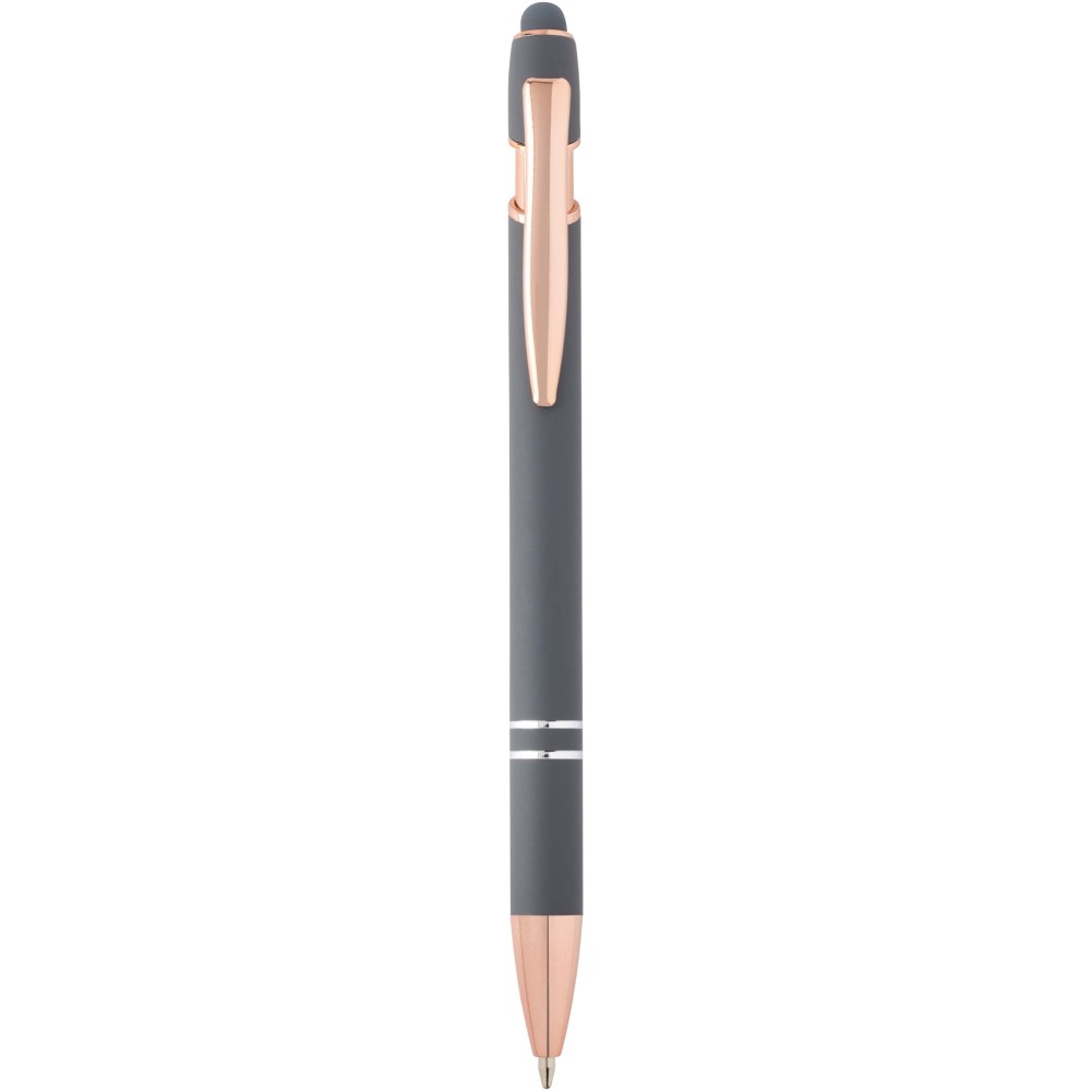Nanna golyóstoll elegáns rózsaarany színben. A toll teste újrahasznosított alumíniumból, az érintőceruza pedig szilikonból készült, így érintőképernyős eszközökhöz is használható. Az újrahasznosított alumínium csökkenti a hulladéklerakók terhelését, segít megőrizni a természeti erőforrásokat, és célja az üvegházhatású gázok kibocsátásának mérséklése. Tinta színe: kék. Íráshossz: 800 méter. Tollhegy mérete: 1,0 mm. Emblémázás: Gravírozás, UV nyomtatás