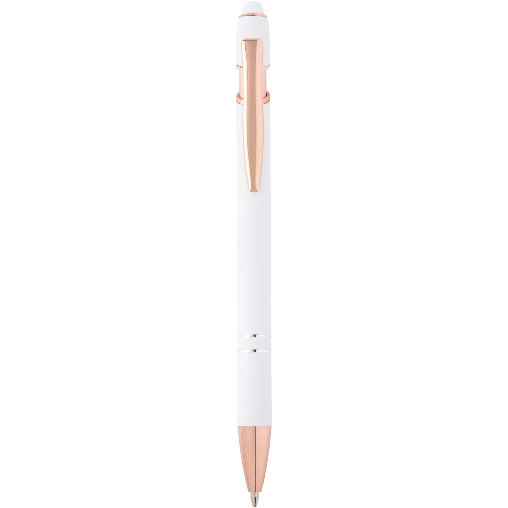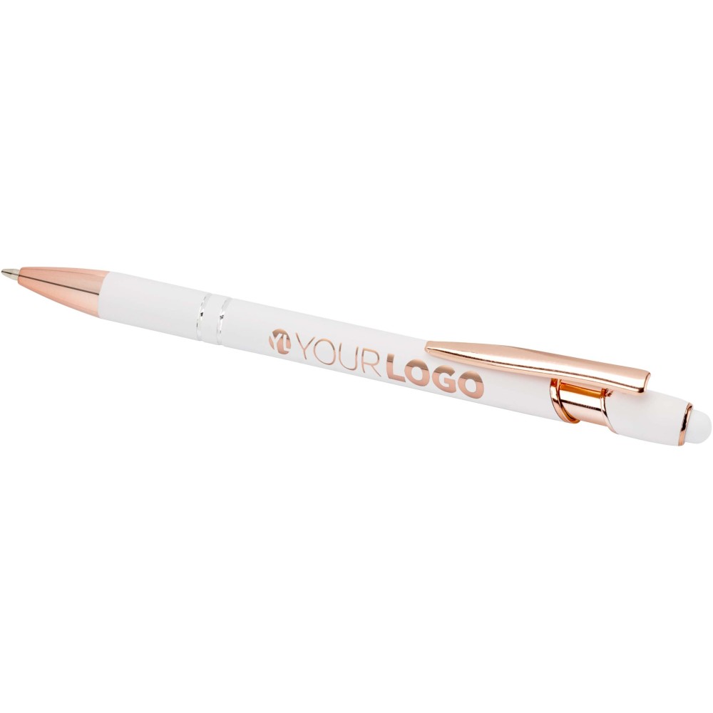 A Nanna golyóstoll rózsaarany bevonattal újrahasznosított alumíniumból készült tolltesttel és szilikon, érintőképernyős véggel rendelkezik. Az újrahasznosított alumínium csökkenti a hulladék mennyiségét a lerakókban, hozzájárul a természeti erőforrások megőrzéséhez és a károsanyag-kibocsátás mérsékléséhez. Tinta színe: fekete. Íráshossz: 800 méter. Tollhegy mérete: 1,0 mm. Emblémázás: Gravírozás, UV nyomtatás