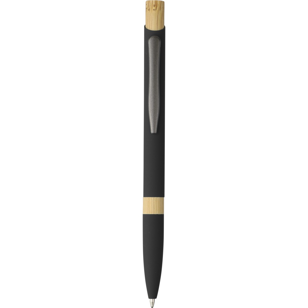 Golyóstoll újrahasznosított alumíniumból, gumírozott bevonattal, bambusz nyomógombbal és bambusz gyűrűvel a tolltesten. Kék tollbetéttel. A tollhegy vastagsága 1.0 mm, íráshossz: kb. 800 méter. Az újrahasznosított anyagra utaló logó a tollra van gravírozva. Emblémázás: Gravírozás