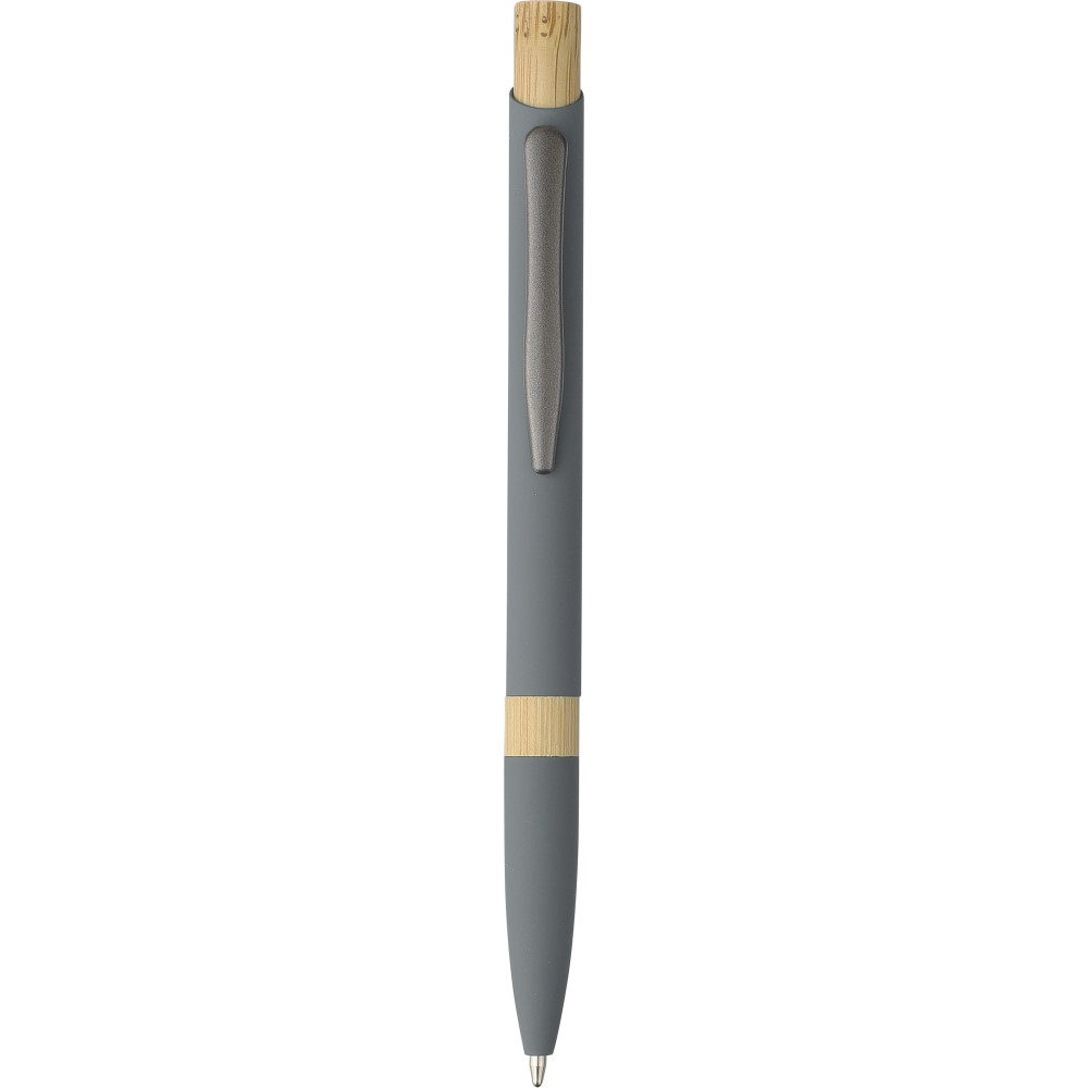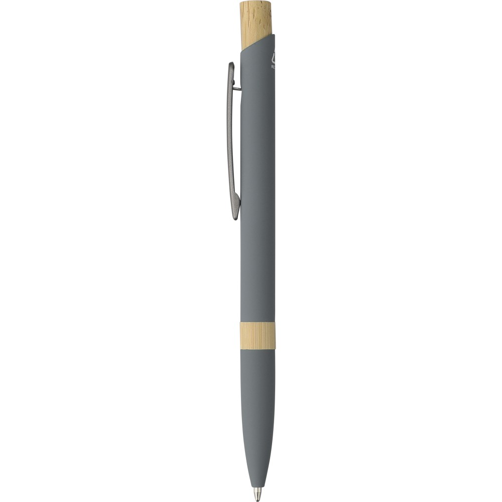 Golyóstoll újrahasznosított alumíniumból, gumírozott bevonattal, bambusz nyomógombbal és bambusz gyűrűvel a tolltesten. Kék tollbetéttel. A tollhegy vastagsága 1.0 mm, íráshossz: kb. 800 méter. Az újrahasznosított anyagra utaló logó a tollra van gravírozva. Emblémázás: Gravírozás