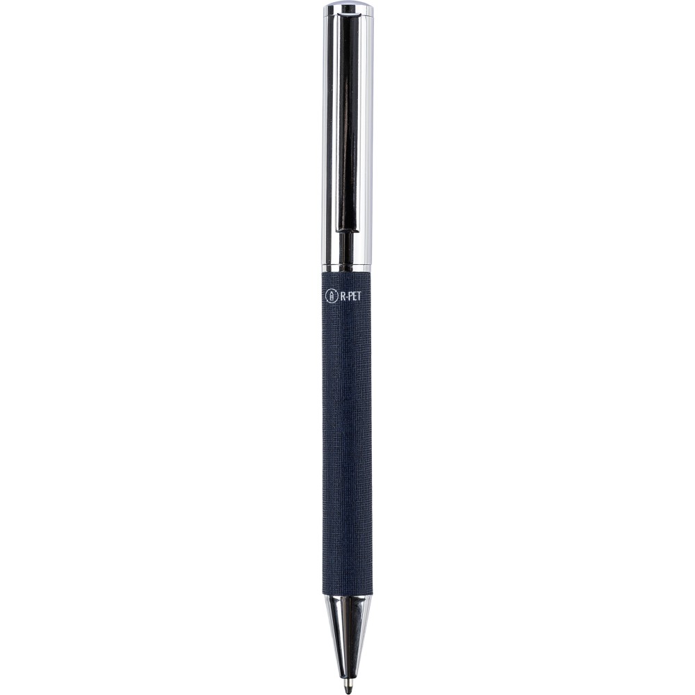 Sárgaréz és rPET csavaros golyóstoll fém klipsszel és markolattal. RPET logóval a tolltesten. Egyenként csomagolva barna kartondobozban. Kék tollbetéttel. Emblémázás: Gravírozás