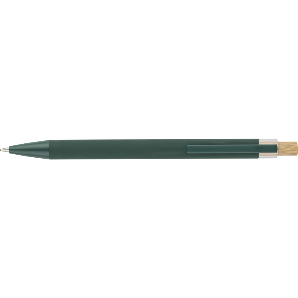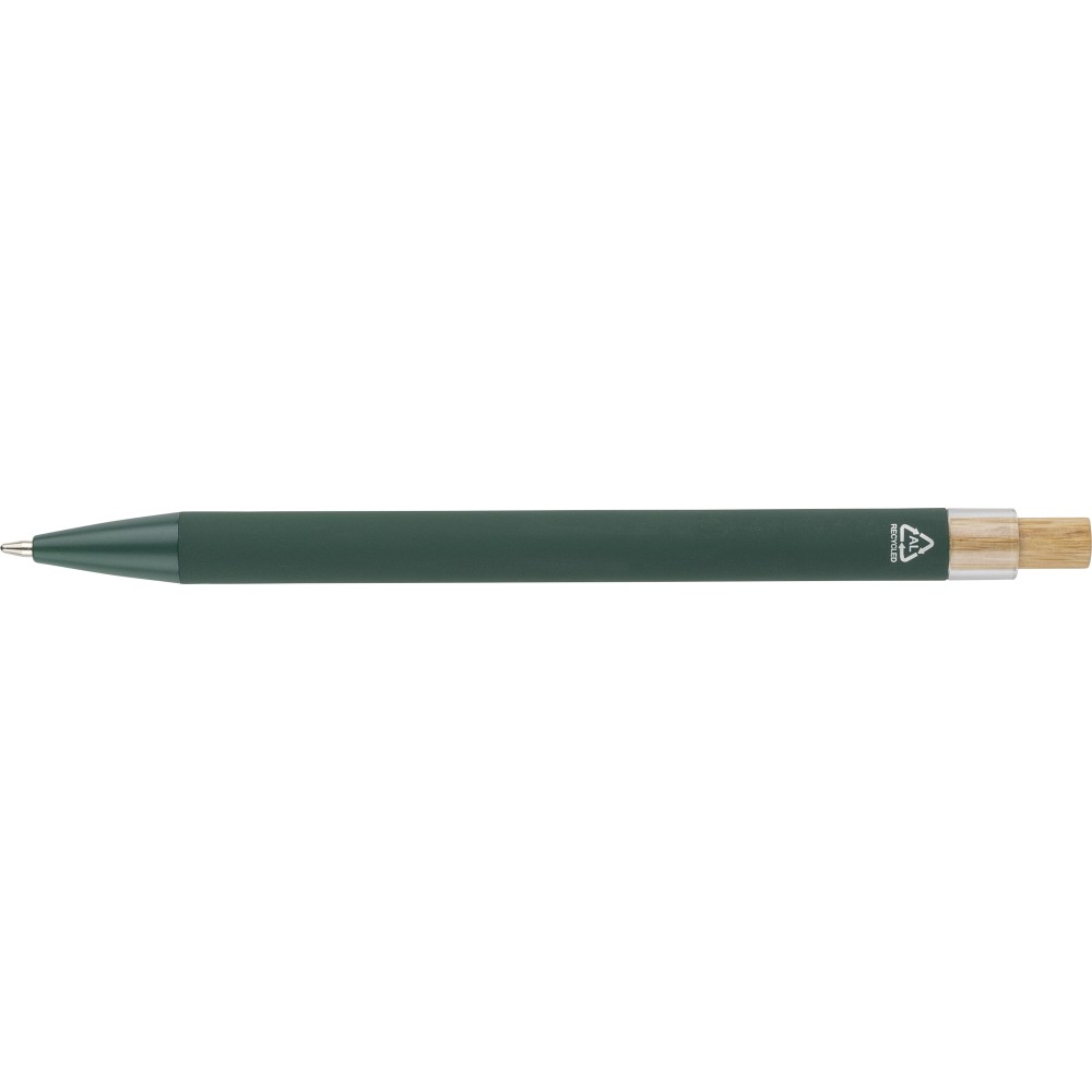 Újrahasznosított alumíniumból készült golyóstoll bambusz nyomógombbal és AS műanyag díszítéssel, fém klippel és a toll színével harmonizáló műanyag tollheggyel. A tolltesten lézergravírozott recycled (újrahasznosított) alapanyagra utaló logó található. Megközelítőleg 800 méter íráshosszúságú, kék színű tollbetéttel. Emblémázás: Gravírozás
