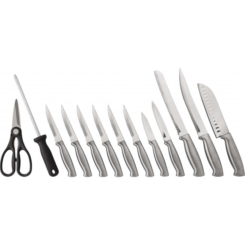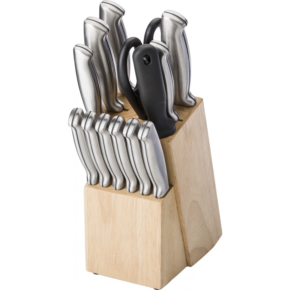 Konyhai készlet rozsdamentes acélból és PP műanyagból. A gumifa talp 13 db konyhai eszközt tartalmaz: olló, élező és különböző kések. Emblémázás: Gravírozás, Tamponnyomás
