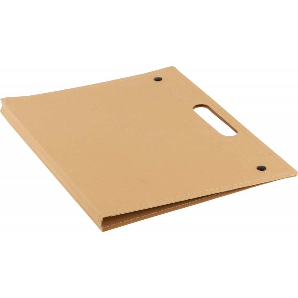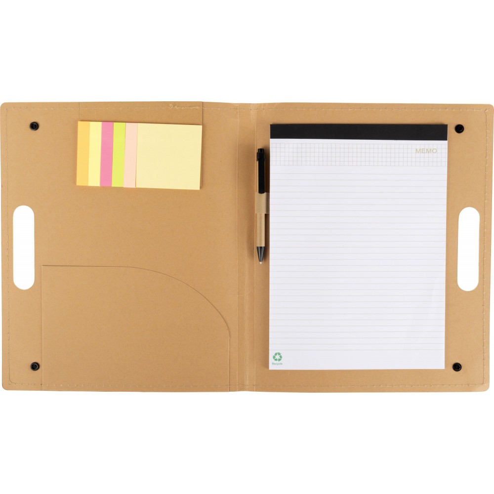 Karton mappa tartalma: 20 lapos jegyzettömb (kb. A4), egy karton toll fekete tintával és öntapadó jelölők 4 színben, 25 lappal színenként. 70 g, 600 g papír. Emblémázás: Szitanyomás, Tamponnyomás