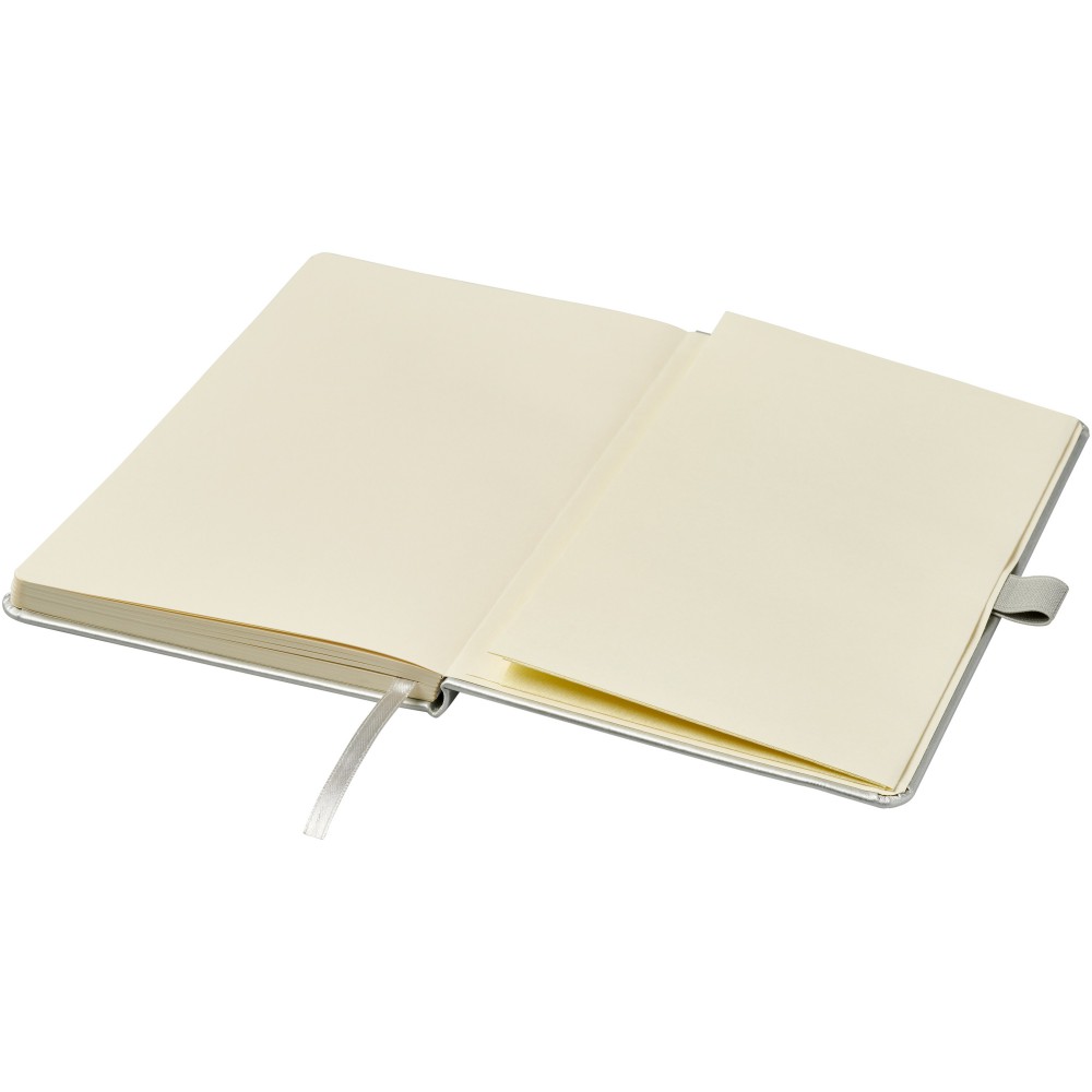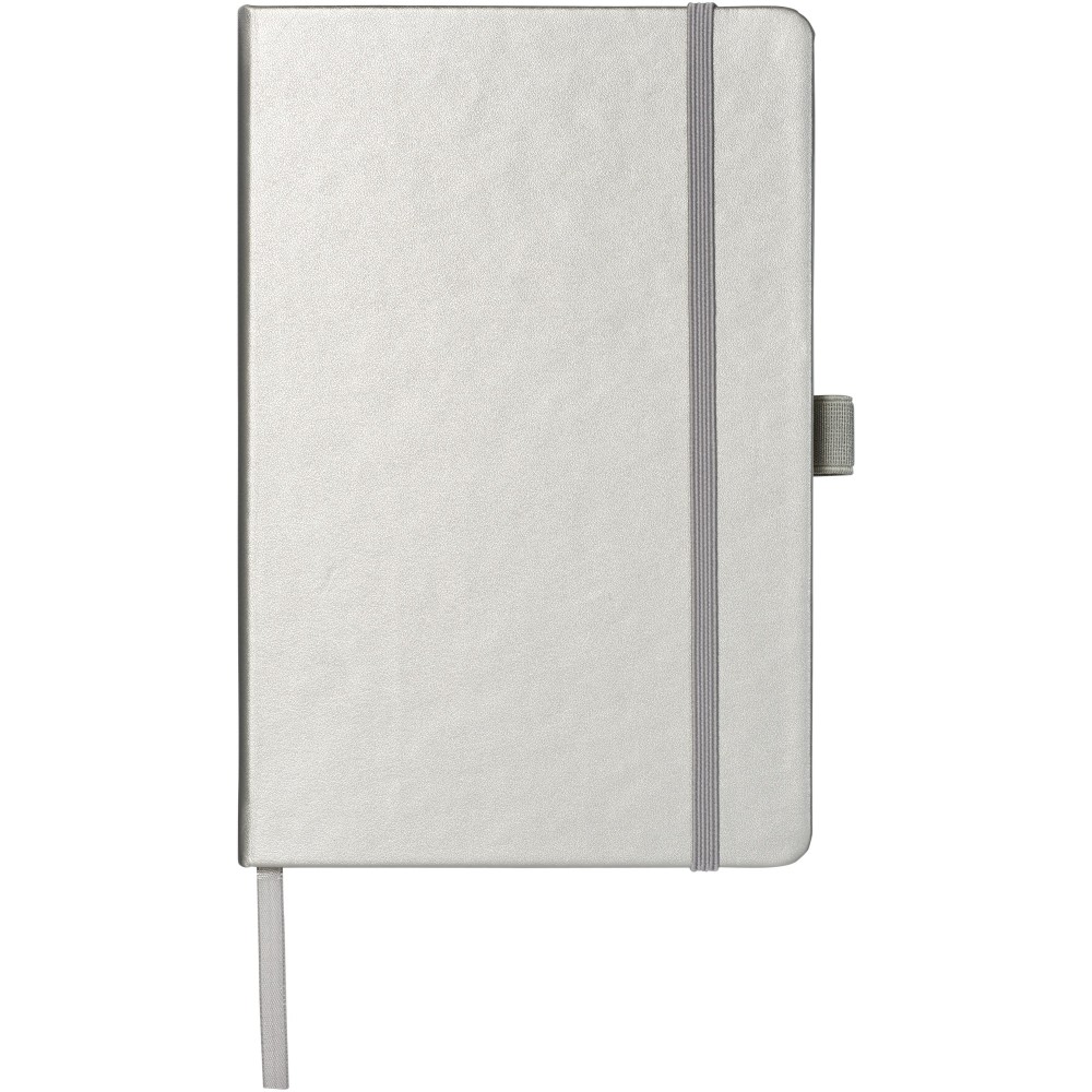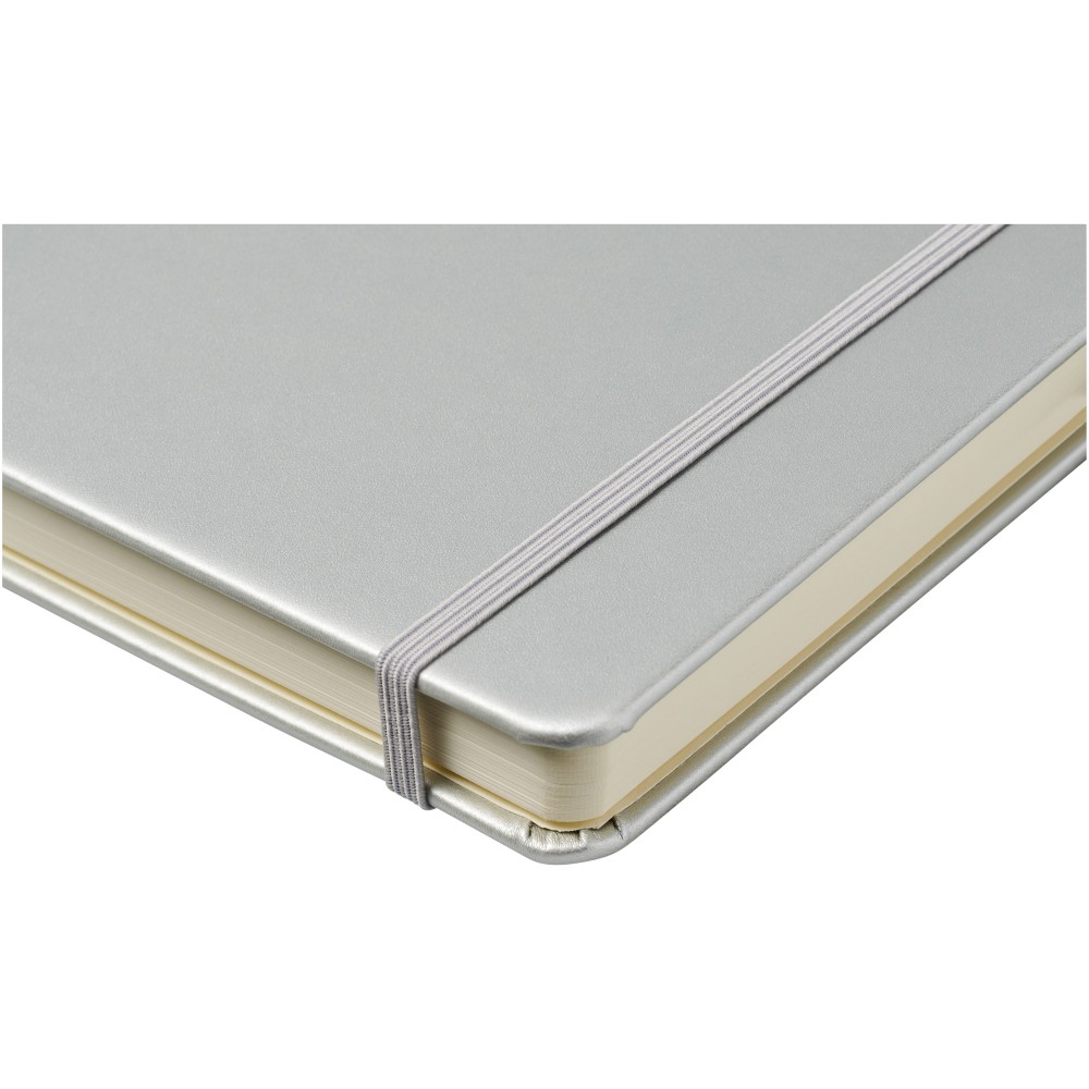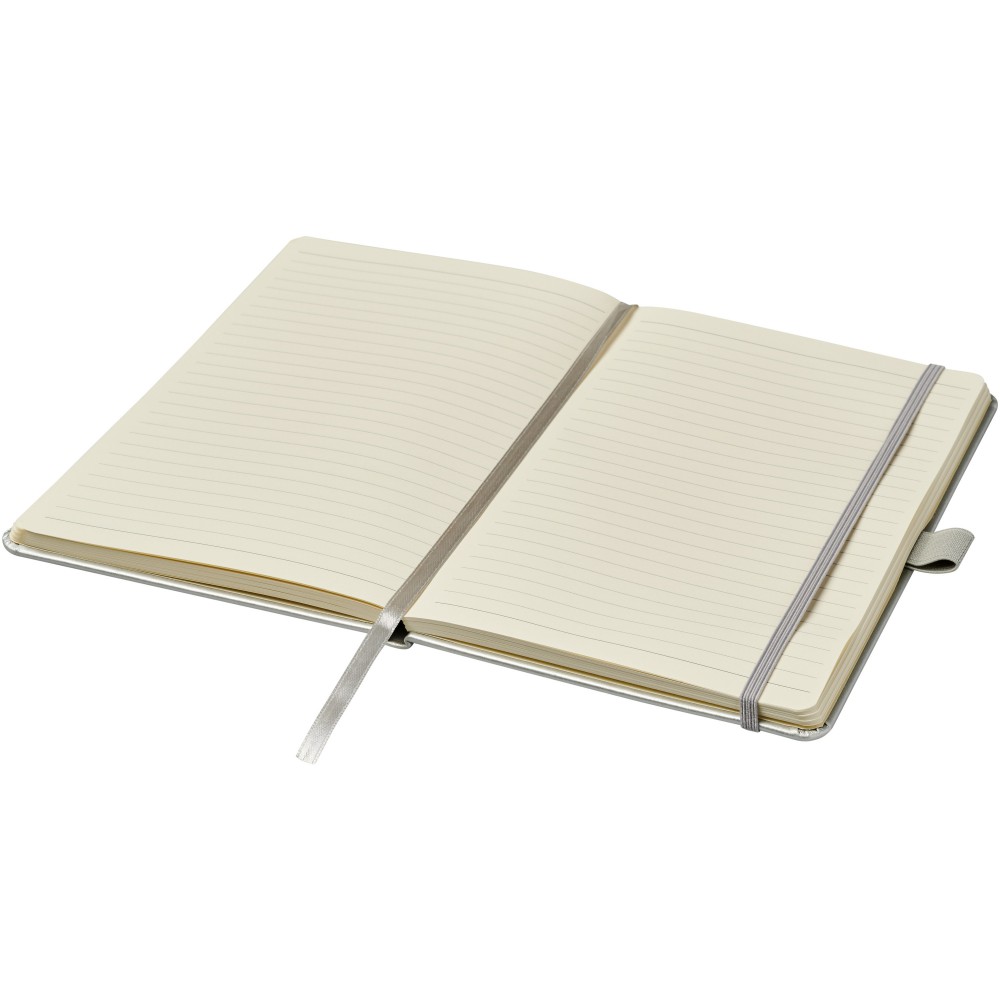 Műbőr A5-ös (14,2 cm x 21,4 cm) jegyzetfüzet gumiszalaggal, szalagjelölővel, tollhurokkal és harmonika hátsó zsebbel. 96 db vonalas krémszínű lapot tartalmaz (80 g/m2). Emblémázás: Tamponnyomás, UV nyomtatás