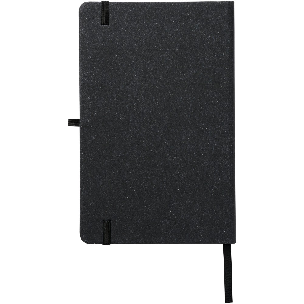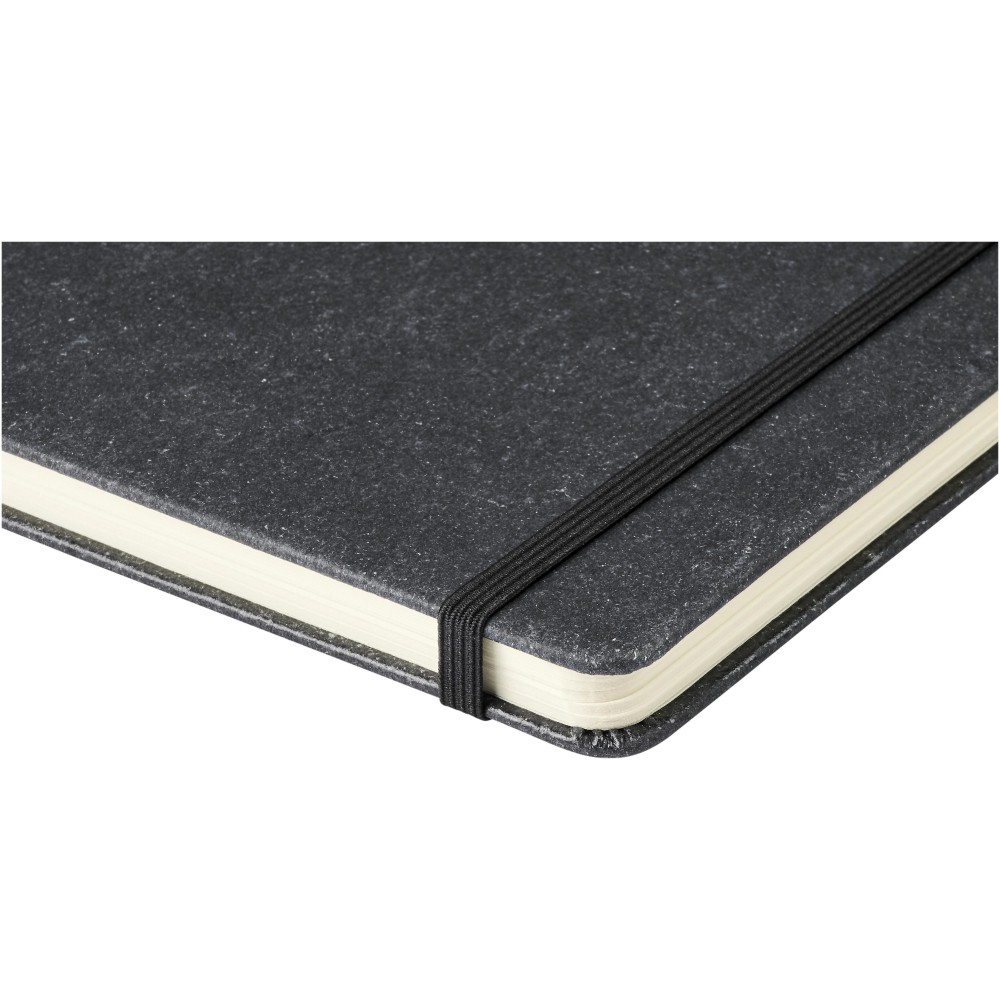 A5 méretű füzet, újrahasznosított bőr borítással. Gumi zárószalaggal, tollhurokkal, könyvjelzővel és 80 (80gsm) vonalas lappal. Emblémázás: Tamponnyomás