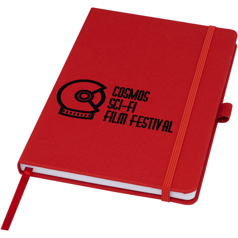 A5 jegyzetfüzet újrahasznosított PET műanyagból készült szövet borítóval. 80 lap 70 g/m2 újrahasznosított, vonalas papír, tolltartó hurok és szalag könyvjelző. Kombinálható a 107757 Honua RPET golyóstollal. Emblémázás: Szitanyomás