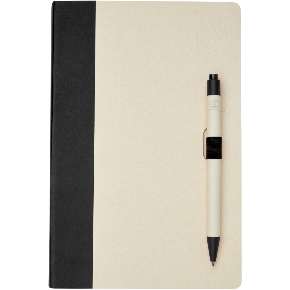 A5 méretű füzet és golyóstoll készlet. A jegyzetfüzet 80 vonalas lapot (80 g/m2) tartalmaz, amelyek újrahasznosított tejes kartondobozokból készülnek (akár 70%), színes papírgerinccel és egy tollhurokkal. A tollhurokban egy nyomógombos golyóstoll található a jegyzetfüzet színéhez illő színben. A toll teste ugyanabból az újrahasznosított anyagból készült, a gomb, a klipsz és a hegy pedig színes PLA műanyagból készült. A toll fekete tollbetéttel érkezik. A használt tejesdobozokat összegyűjtik, válogatják, feldolgozzák és papírrá alakítják, így a hulladékból hasznos termék készül. Emblémázás: Szitanyomás, Tamponnyomás