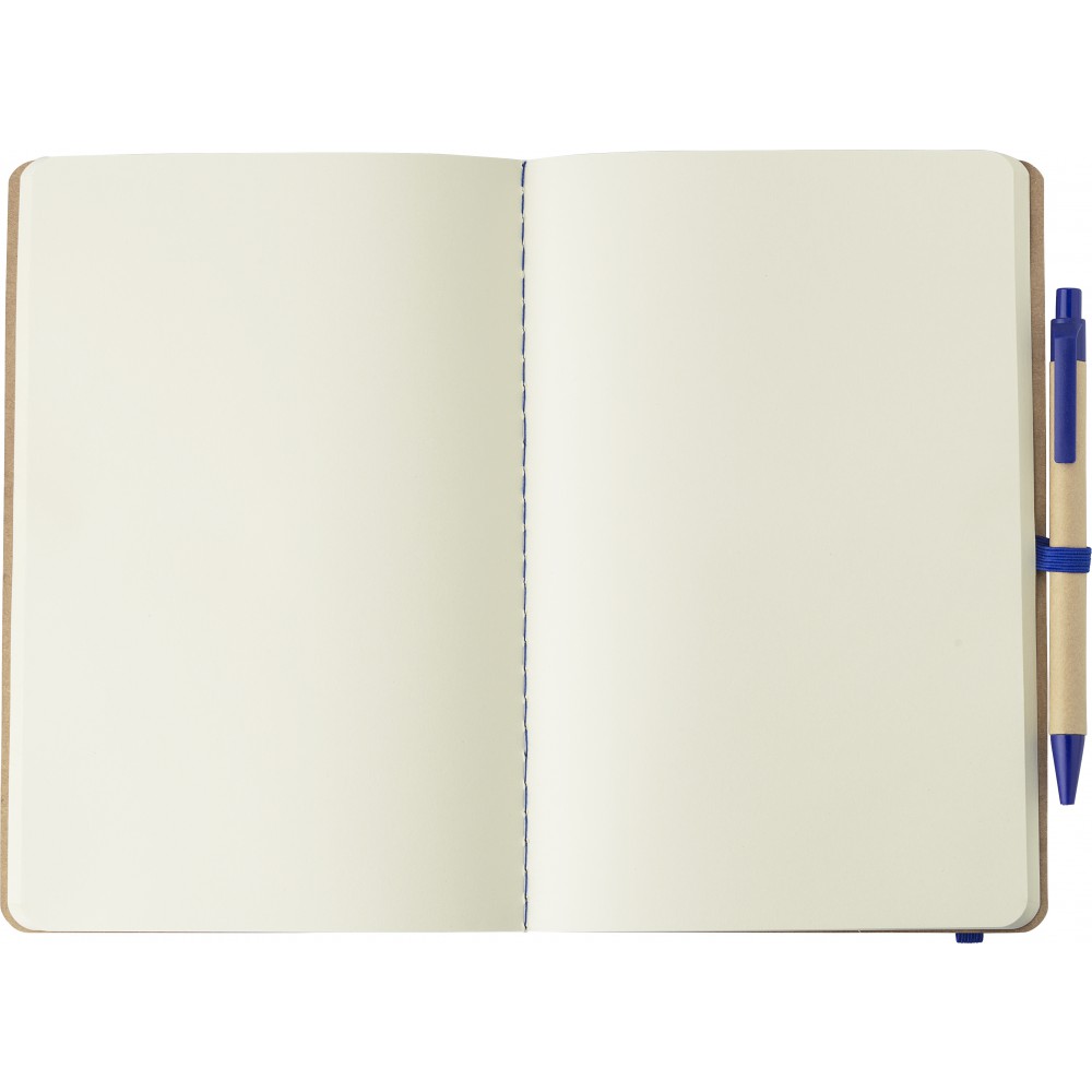 Újrahasznosított karton jegyzetfüzet 60 sima lappal. Tartalmazza a hozzáillő karton/szalma tollat kék tollbetéttel. Gumis összefogó pánt és tollhurok. Emblémázás: Szitanyomás, Tamponnyomás, UV nyomtatás