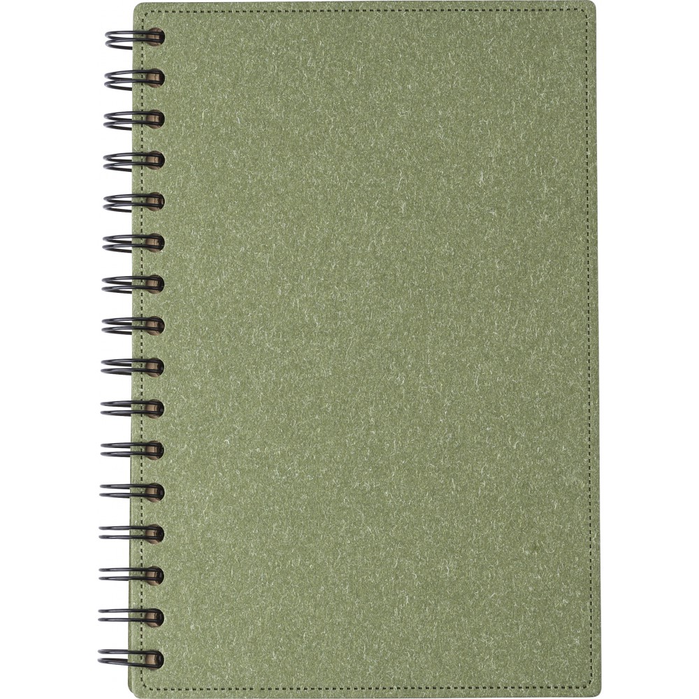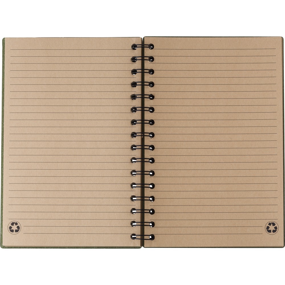 Újrahasznosított kartonból készült, keményfedeles spirálfüzet 80 vonalas, újrahasznosított barna papírlappal. Lapok minősége: 65 g/m2. Az újrahasznosított alapanyagra utaló logó minden lapon látható. Emblémázás: Tamponnyomás