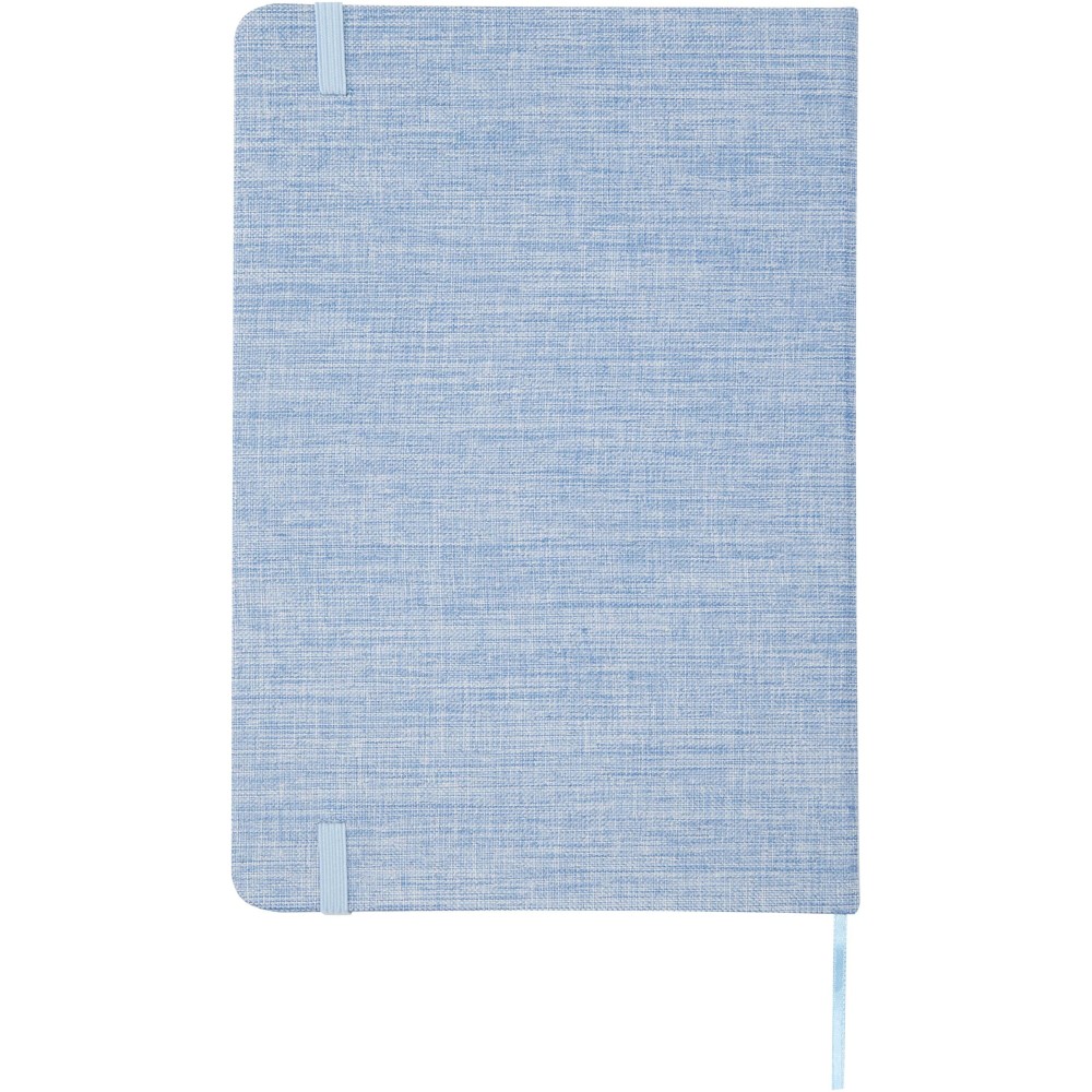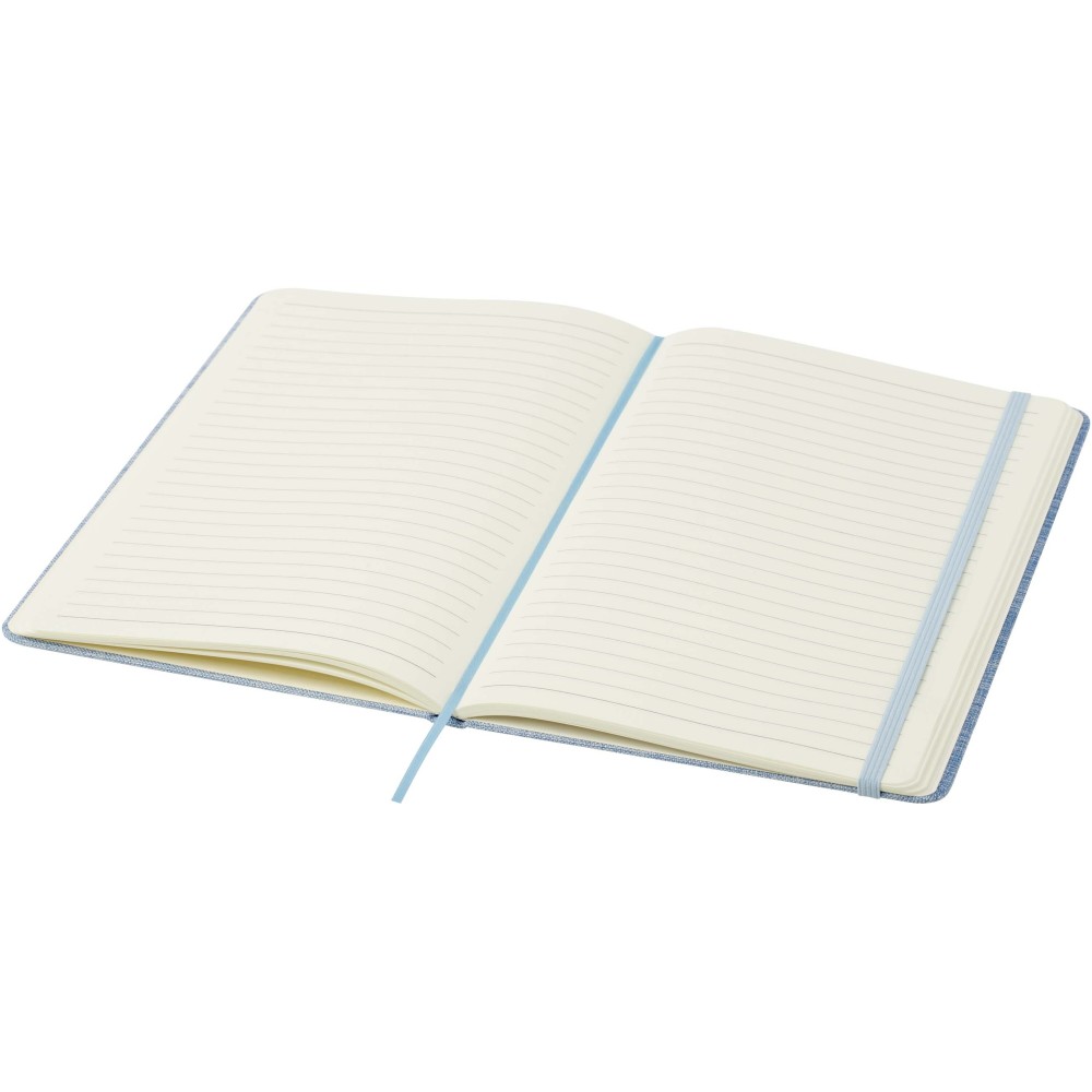 Kemény fedeles A5 jegyzetfüzet újrahasznosított pamutból, 80 soros 70 g/m2 papírral. A jegyzetfüzet gumis záródással, szalaggal és lekerekített sarkokkal rendelkezik. Emblémázás: Szitanyomás