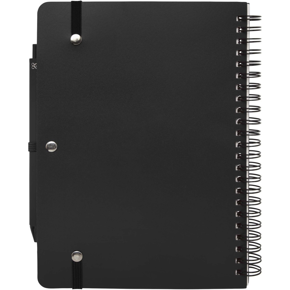 Thalaasa A5 keményfedeles jegyzetfüzet óceánból származó újrahasznosított műanyagból készült, és 80 vonalas, 70 g/m2 krémszínű lapot tartalmaz. A jegyzetfüzet lekerekített sarkokkal, elasztikus zárással és tolltartóval rendelkezik. A fekete tintával író golyóstoll szintén óceánból származó újrahasznosított műanyagból készült. Íráshossz: 1000 méter. Tollhegy mérete: 1,0 mm. Emblémázás: Tamponnyomás