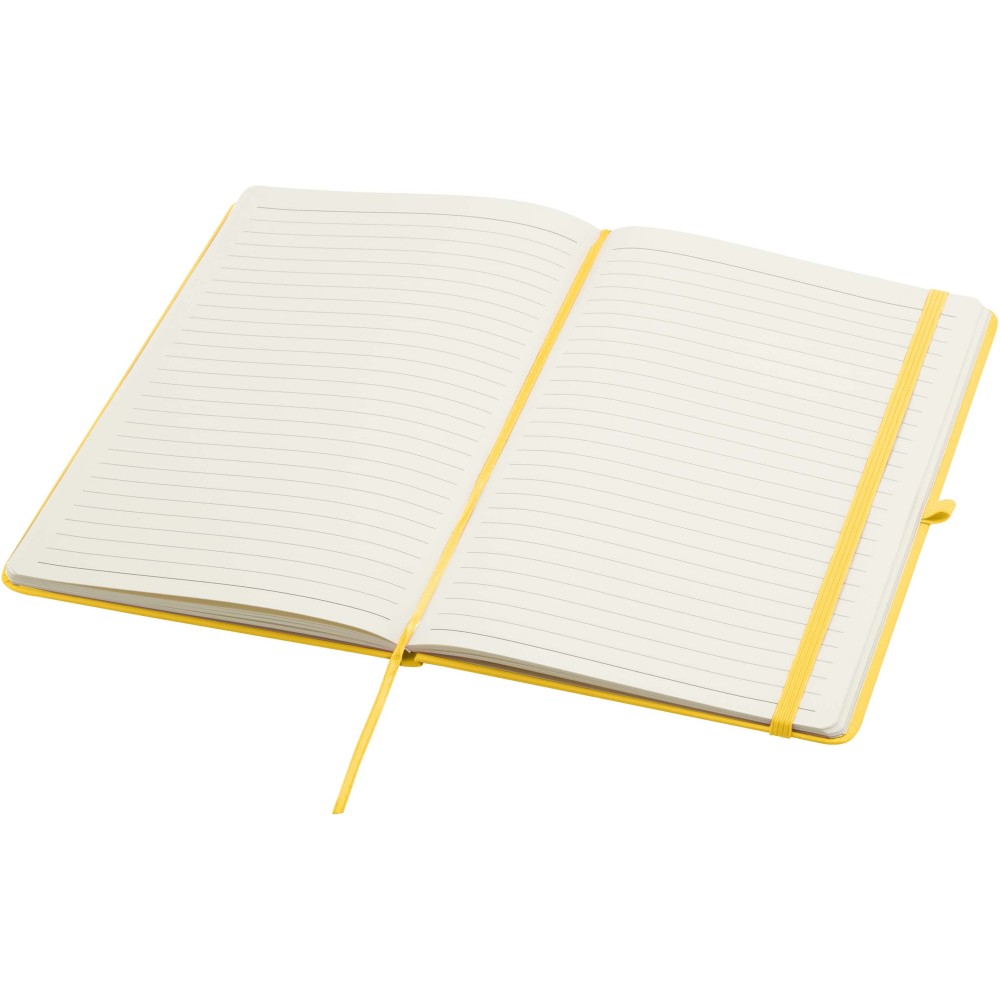 A Spectrum Plus A5 keményfedeles jegyzetfüzet lekerekített sarkokkal nemcsak az irodai mindennapok elengedhetetlen kelléke, hanem remek lehetőség márkád népszerűsítésére is. A jegyzetfüzet puha tapintású borítóval rendelkezik és 80 vonalas, krémszínű, 70 g/m2-es lapból áll, amely tökéletes gyors ötletek vagy hosszabb jegyzetek rögzítésére. A jegyzetfüzet tolltartó hurokkal, gumiszalagos záródással, könyvjelzővel és harmonikazsebbel van ellátva. Emblémázás: Tamponnyomás, UV nyomtatás