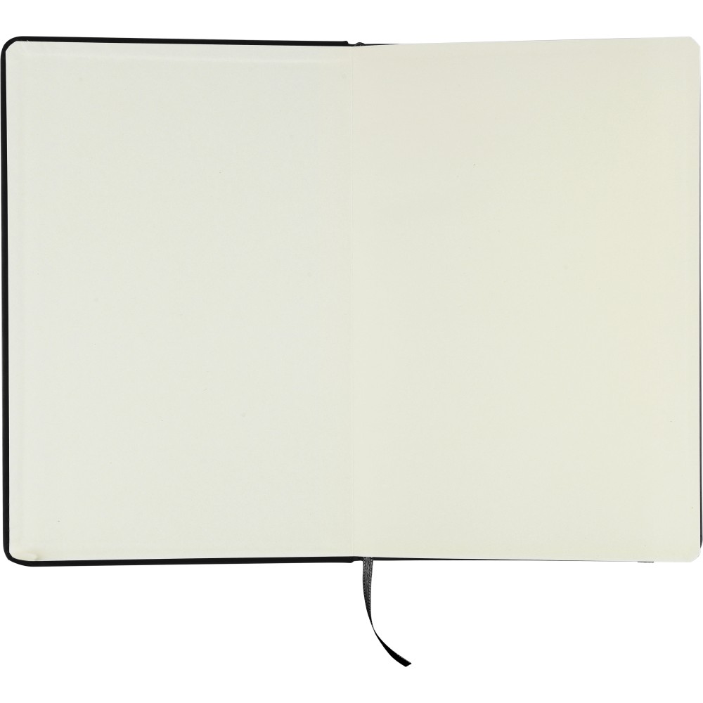 A5-ös méretű jegyzetfüzet rPET PU anyagból készült kemény borítóval, 80 vonalas lappal (70g/m2), színben illeszkedő gumipánttal és könyvjelző szalaggal. Az újrahasznosított anyagra utaló dombornyomott logóval a füzet hátoldalán. Emblémázás: Szitanyomás, Tamponnyomás, UV nyomtatás