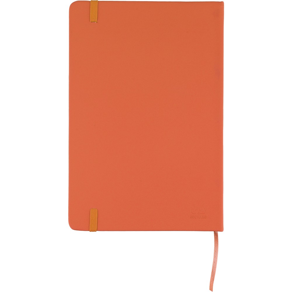 A5-ös méretű jegyzetfüzet rPET PU anyagból készült kemény borítóval, 80 vonalas lappal (70g/m2), színben illeszkedő gumipánttal és könyvjelző szalaggal. Az újrahasznosított anyagra utaló dombornyomott logóval a füzet hátoldalán. Emblémázás: Szitanyomás, Tamponnyomás, UV nyomtatás