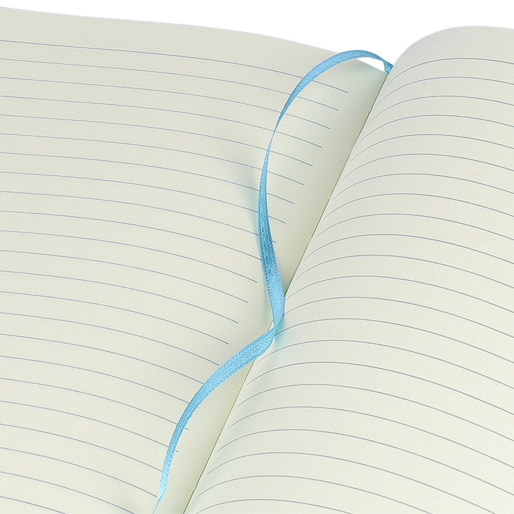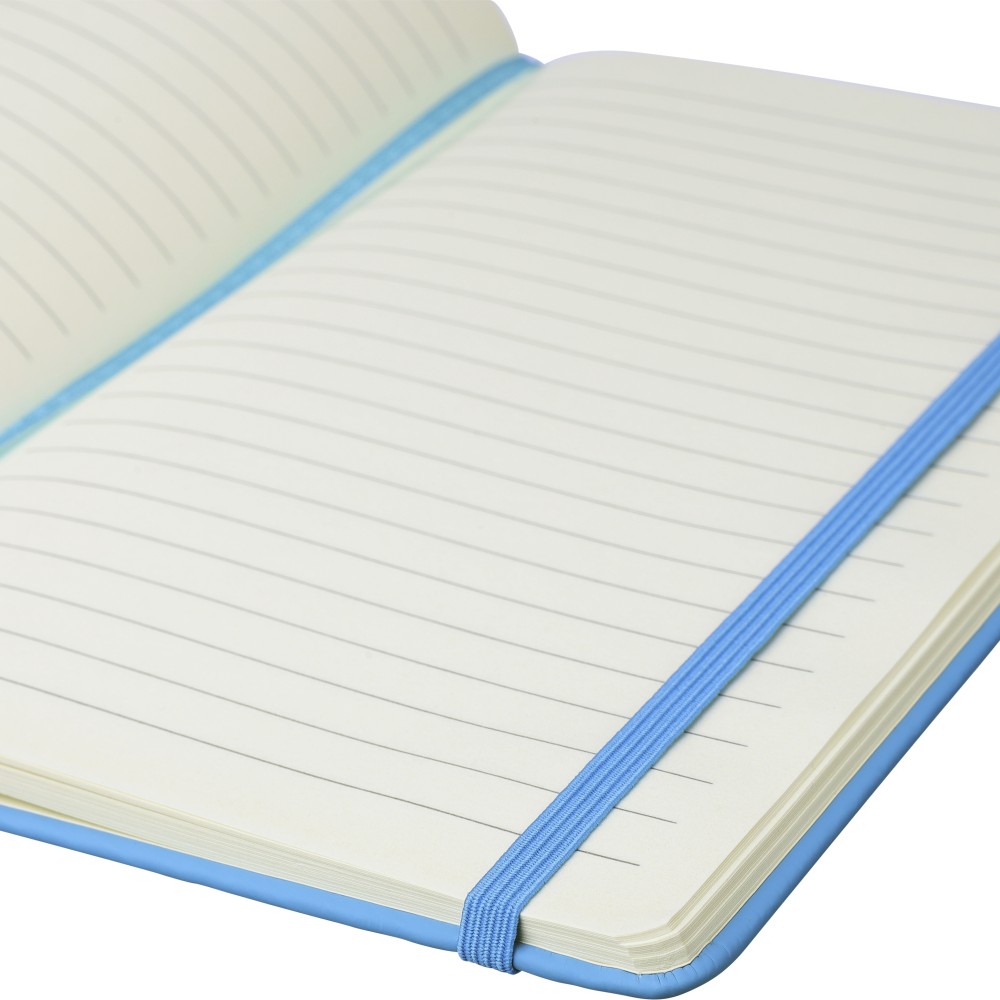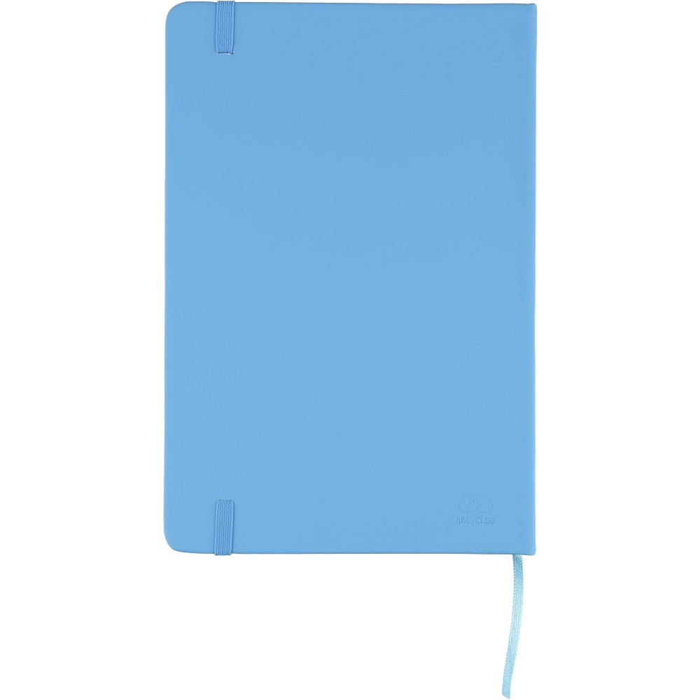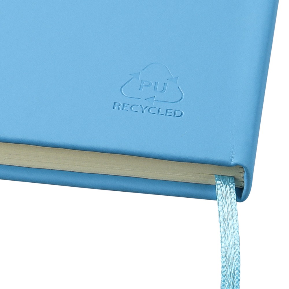 A5-ös méretű jegyzetfüzet rPET PU anyagból készült kemény borítóval, 80 vonalas lappal (70g/m2), színben illeszkedő gumipánttal és könyvjelző szalaggal. Az újrahasznosított anyagra utaló dombornyomott logóval a füzet hátoldalán. Emblémázás: Szitanyomás, Tamponnyomás, UV nyomtatás