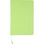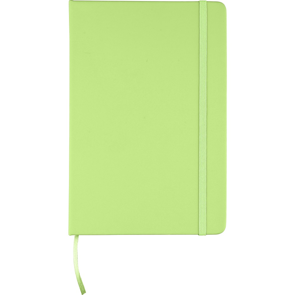 A5-ös méretű jegyzetfüzet rPET PU anyagból készült kemény borítóval, 80 vonalas lappal (70g/m2), színben illeszkedő gumipánttal és könyvjelző szalaggal. Az újrahasznosított anyagra utaló dombornyomott logóval a füzet hátoldalán. Emblémázás: Szitanyomás, Tamponnyomás, UV nyomtatás