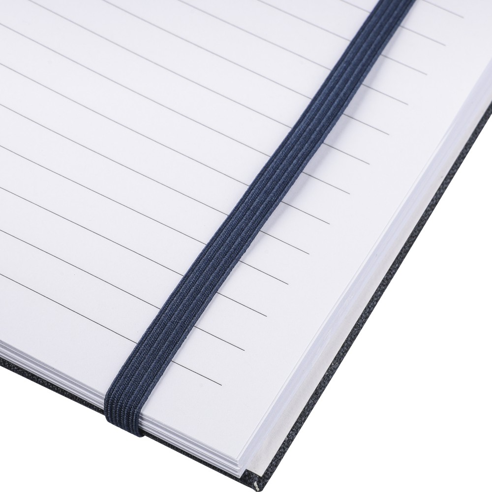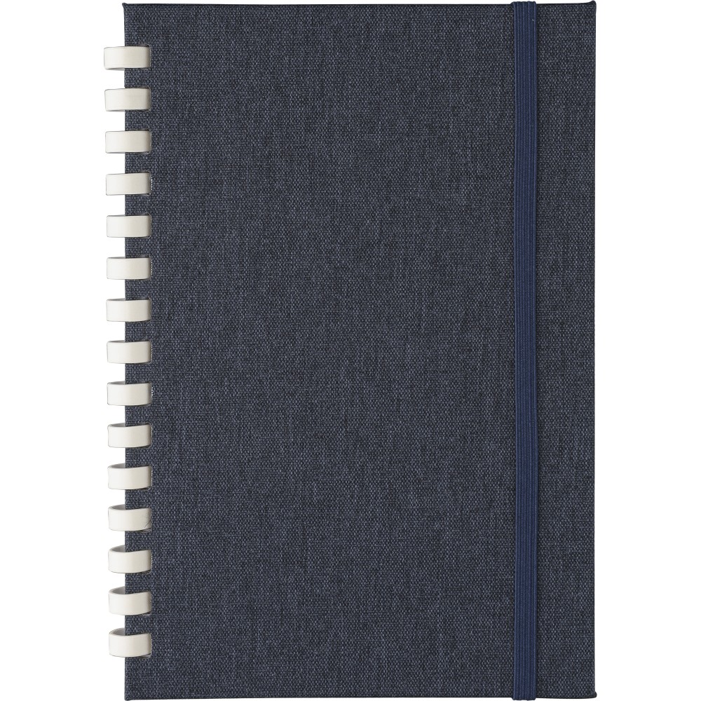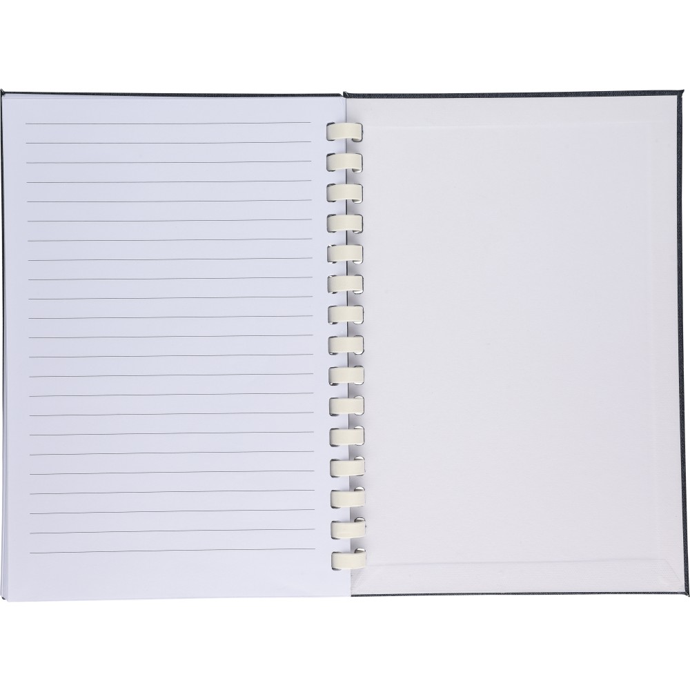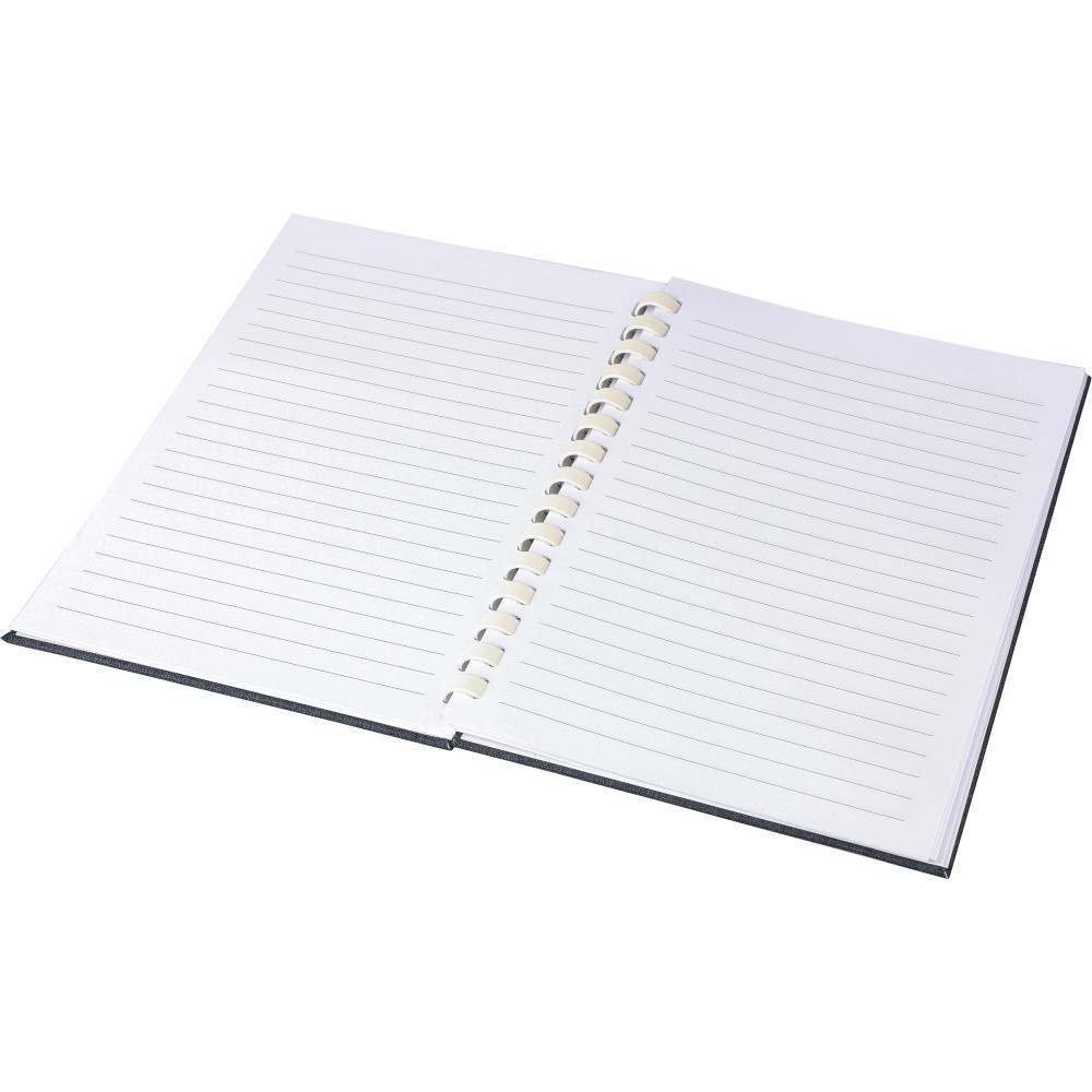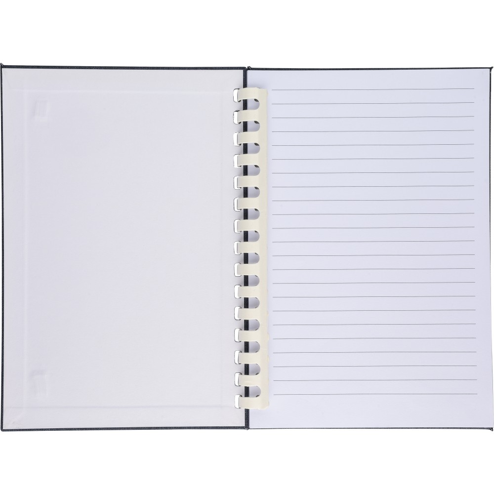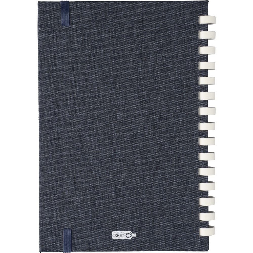 rPET jegyzetfüzet, kb. A5-ös méretű, 80 lapos. Kemény borítóval és rugalmas zárópánttal. Fehér karton spirállal (15 karikás), szalagos könyvjelzővel és 70 g/m2-es vonalas papírral. A hátoldalon rPET logóval. Selyempapírba csomagolva, nejlonzacskó nélkül. Emblémázás: Szitanyomás