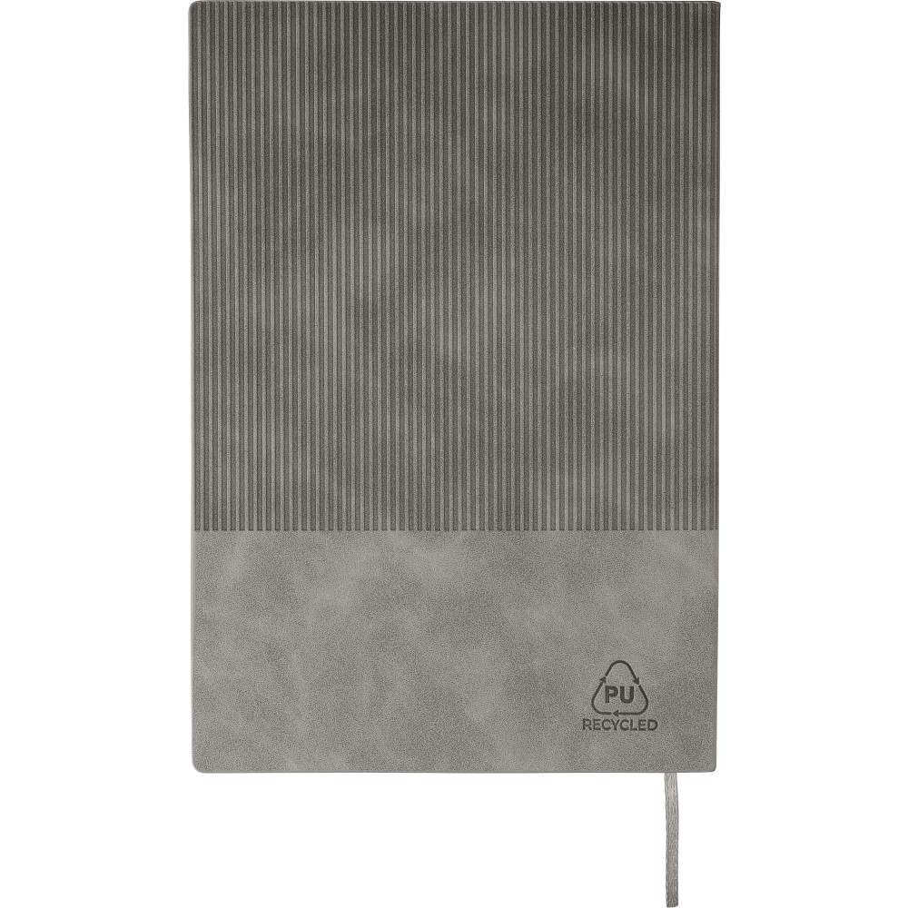 Újrahasznosított PU jegyzetfüzet és golyóstoll szett. A jegyzetfüzet kb. A5-ös méretű, 100 lapos, 80 g/m2-es vonalas lapokkal és szalagos könyvjelzővel, kordbársony hatású borítóval és dombornyomott újrahasznosított logóval rendelkezik. A golyóstoll gumírozott felülettel, csíkos markolattal, krómozott heggyel és lézergravírozott újrahasznosított logóval rendelkezik. Erős barna kartondobozban, EVA betéttel. Kék tollbetéttel szállítjuk. Emblémázás: Gravírozás, Szitanyomás, UV nyomtatás